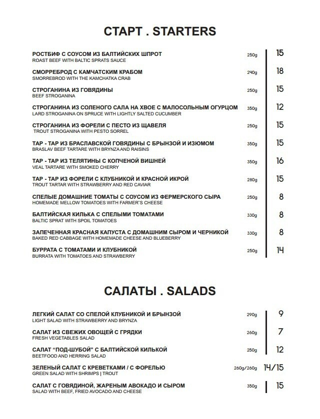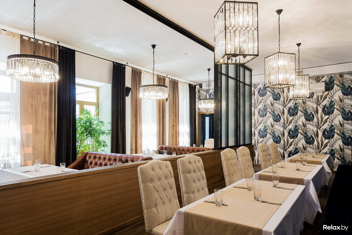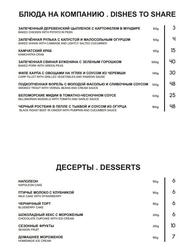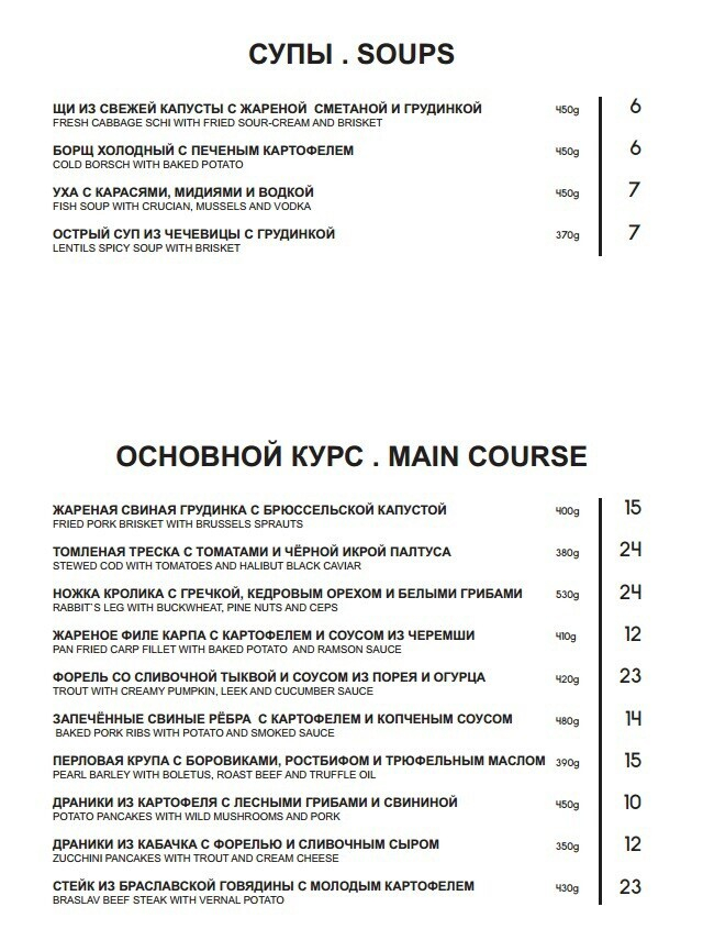 Сейчас в заведении предлагают по большей части блюда славянской кухни в авторской обработке. Например, здесь оригинальная подача строганины (из говядины, рыбы или сала), привычные белорусам супы (щи, уха, борщ) и горячие блюда. Также есть предложения для компаний и десерты. Меню будет меняться в зависимости от сезона.