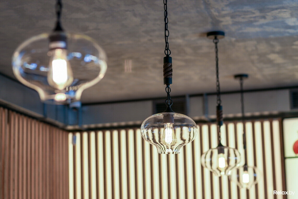 Комфортному времяпрепровождению в заведении будет способствовать и дополнительная раздвижная стенка в центре зала. При большом скоплении гостей или при наличии шумной компании перегородка, частично поглощающая звук, разделит публику и создаст ощущение ее меньшего количества.