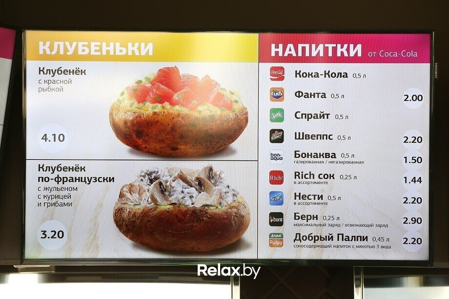 Первое в Минске (и за пределами России в целом) кафе сети «Крошка картошка» в Минске начало работу сегодня на фудкорте столичного ТЦ Galileo. Официально гостей зовут к 14:30 — пообедать. Но уже в 10:30 здесь есть желающие попробовать новый продукт: их накормят сразу, как только поднимутся роллеты. Relax.by заглянул в заведение и узнал, чем там будут кормить и по какой цене.