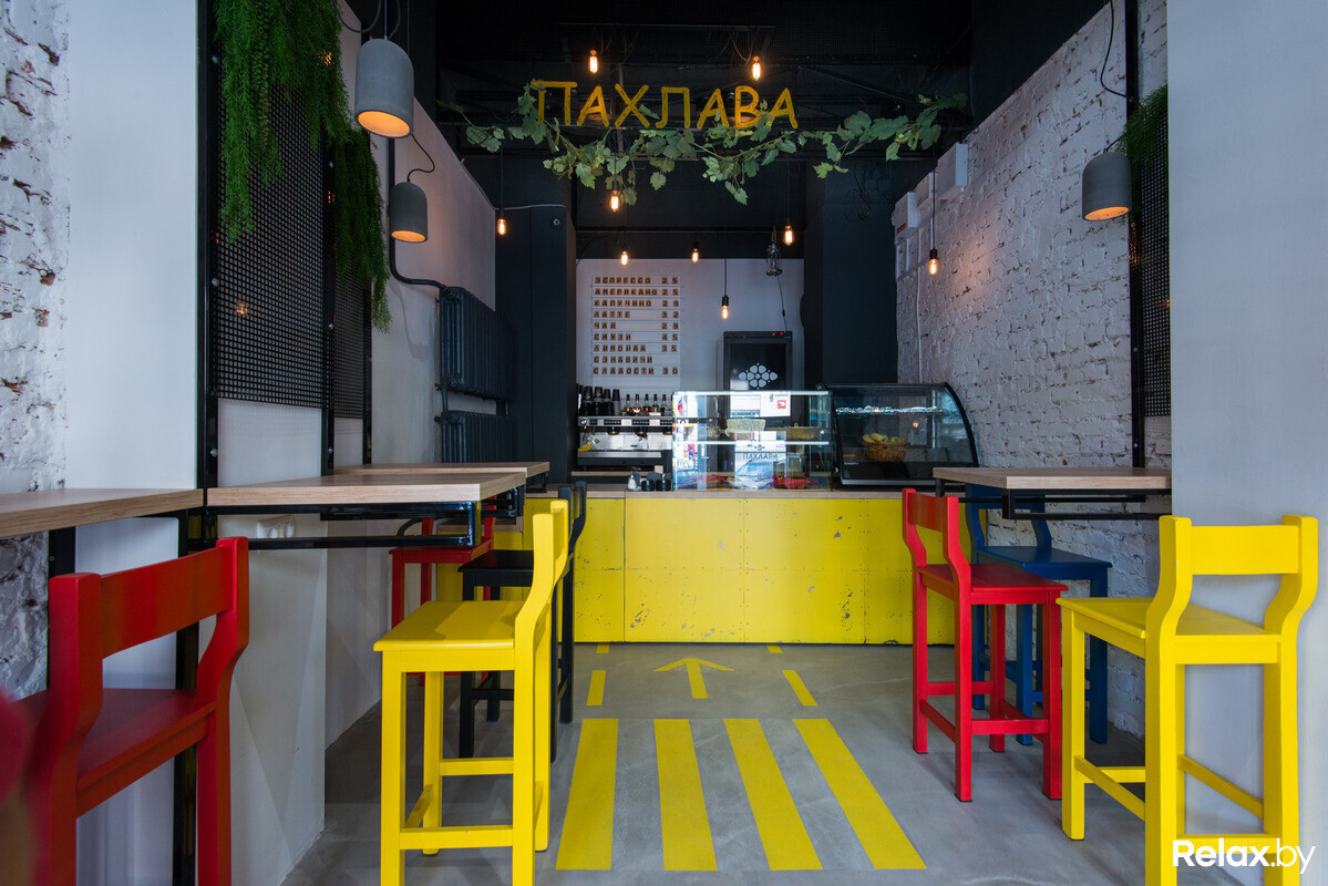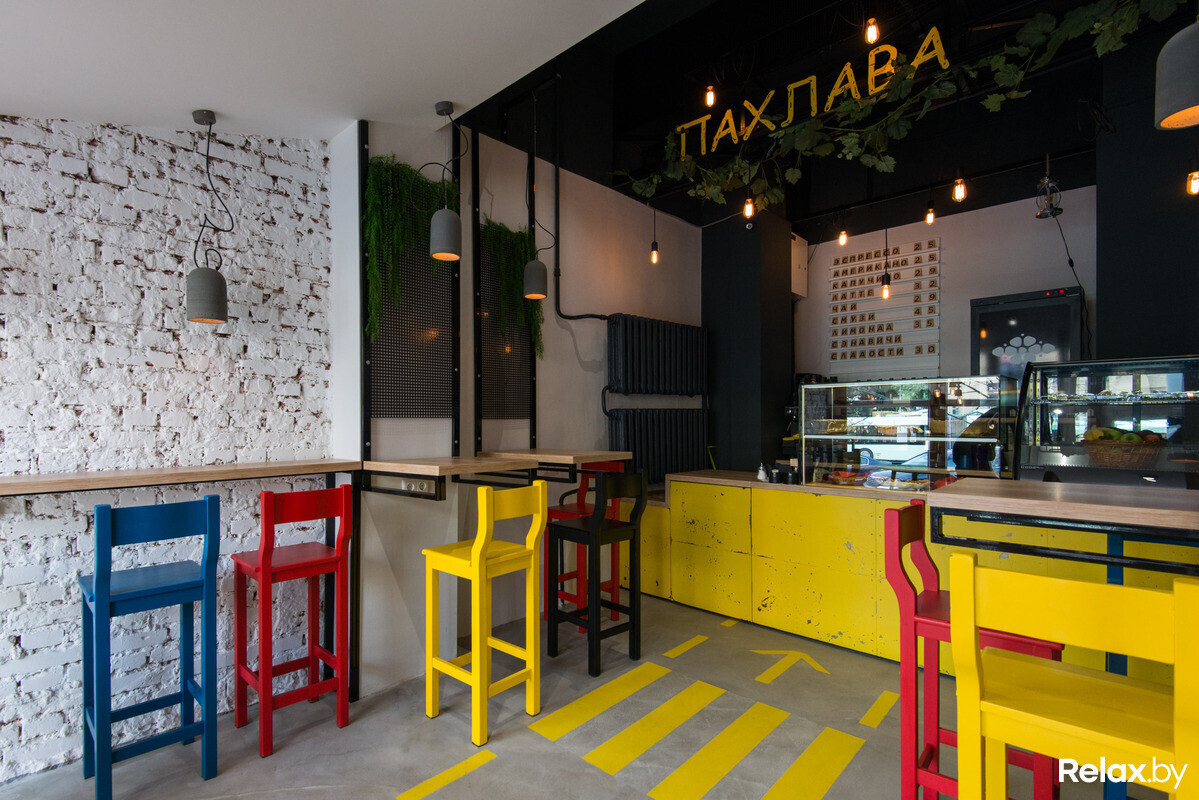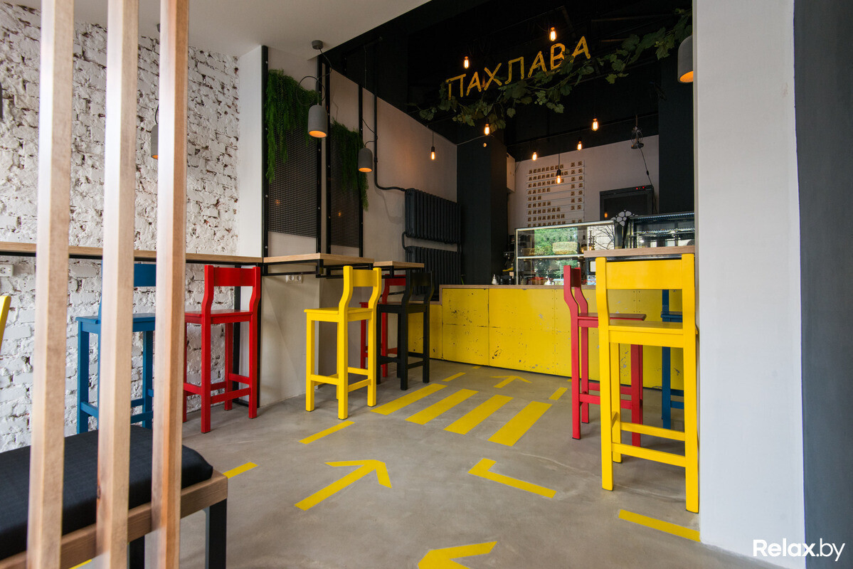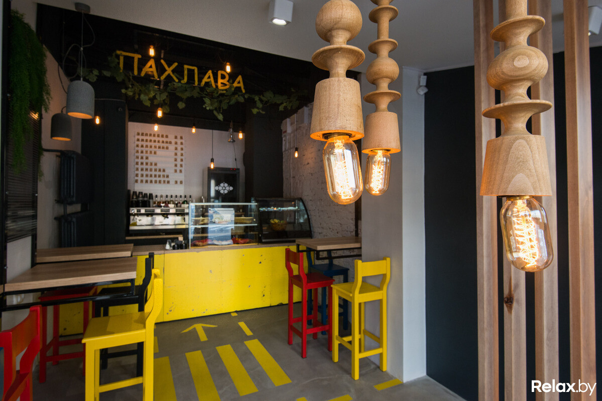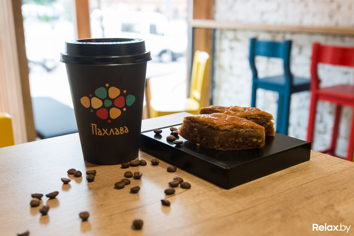 Не так давно в Минске в формате take away начала работу первая кофейня «Пахлава» с азербайджанскими сладостями и авторскими сэндвичами. На вывеске красуется яркая одноименная сладость; она же украшает кофейные стаканчики (причем наносится на каждый вручную).
