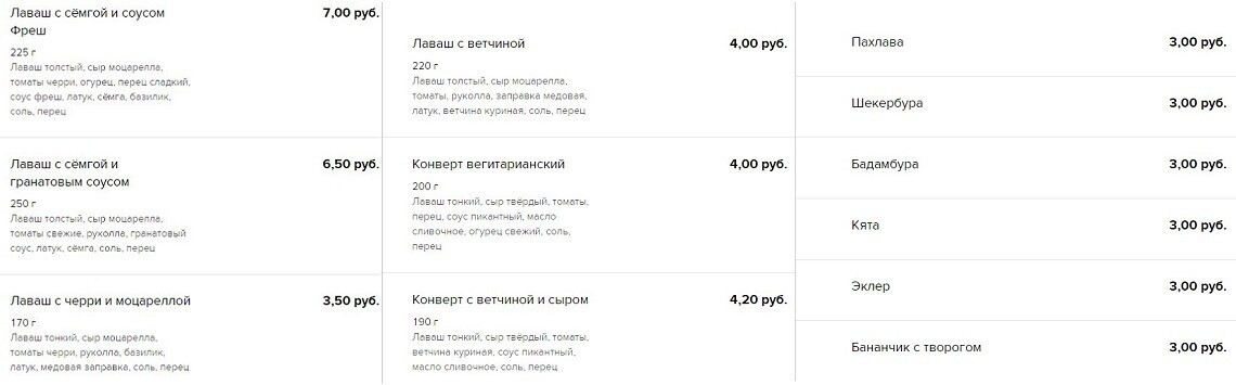 Среди напитков — азербайджанский чай (классический и с наполнителями: финик и мед, чабрец, бергамот, лимон и корица — 2,9 рубля), авторские смузи (молочный с бананом, грушей и мюсли / с сельдереем, яблоками, финиками и огурцом / молочный с персиком, медом, малиной и кунжутом — 4,5 рубля), лимонад (3,5 рубля) и, конечно, все знакомые кофейные напитки (от 2,5 до 4 рублей).