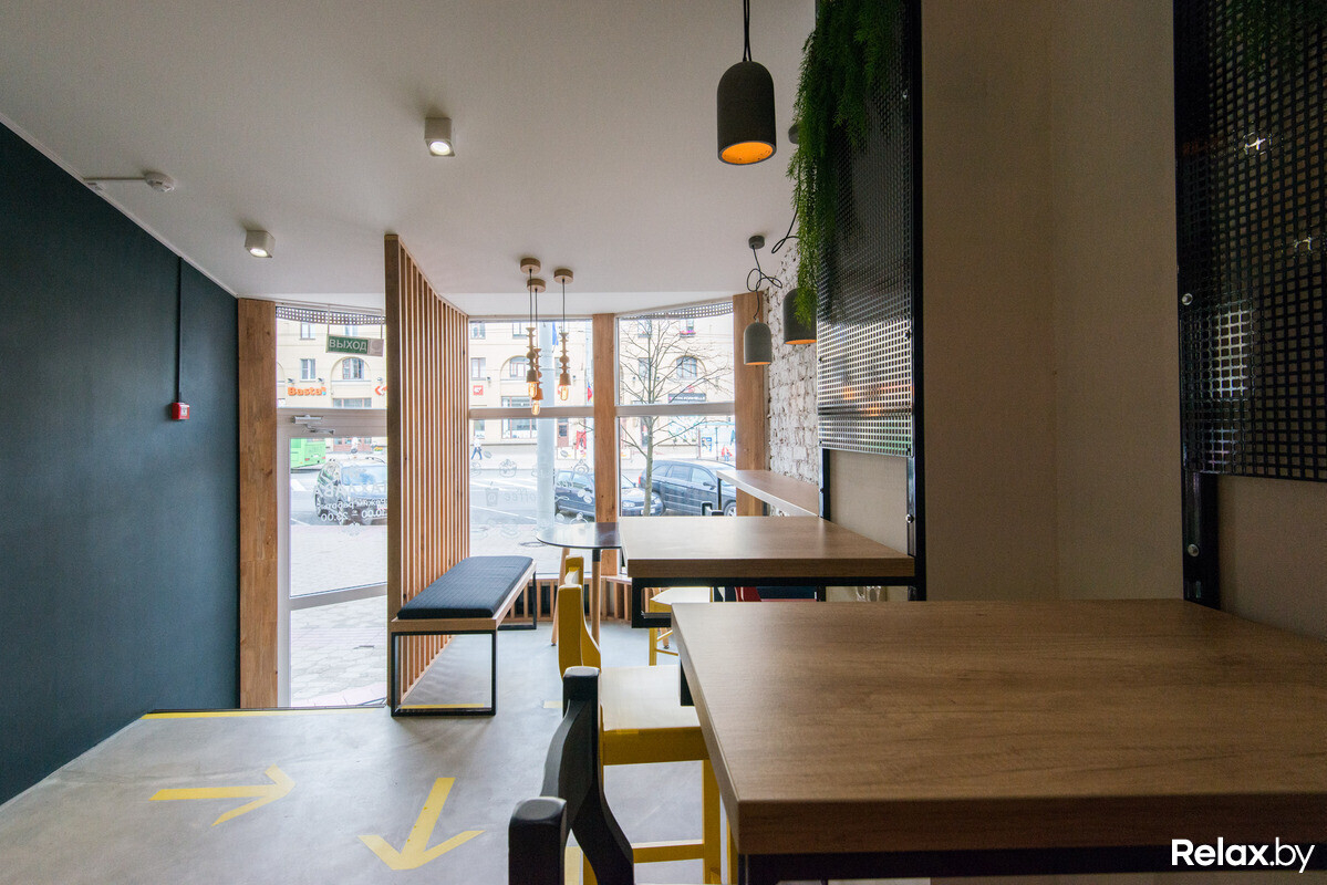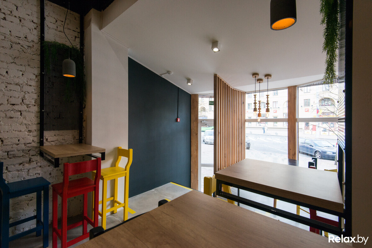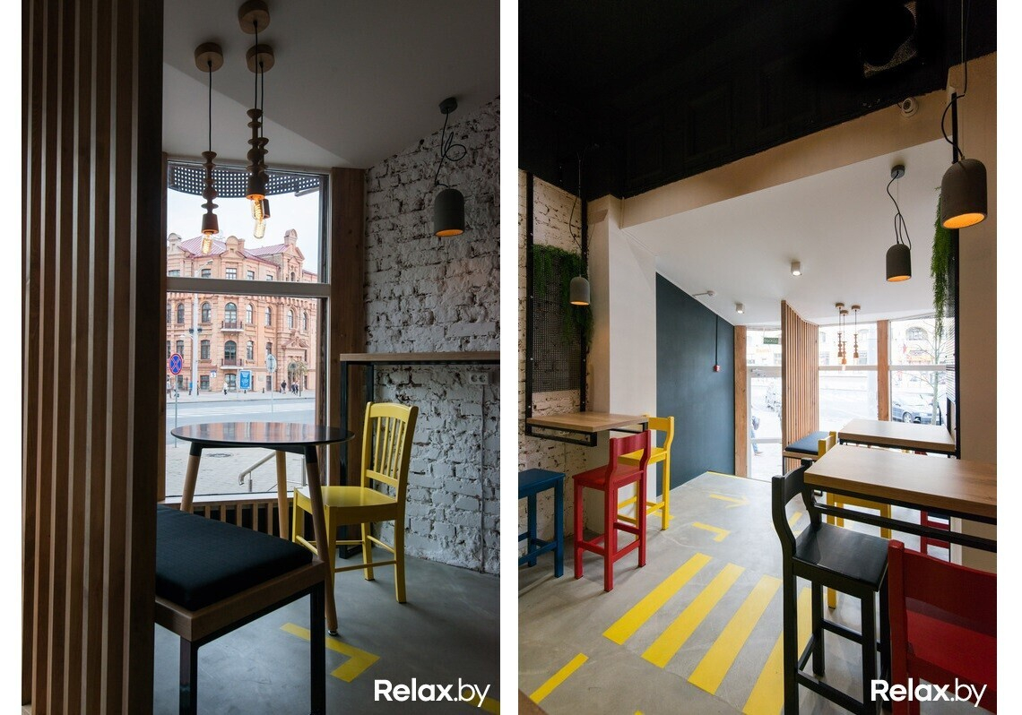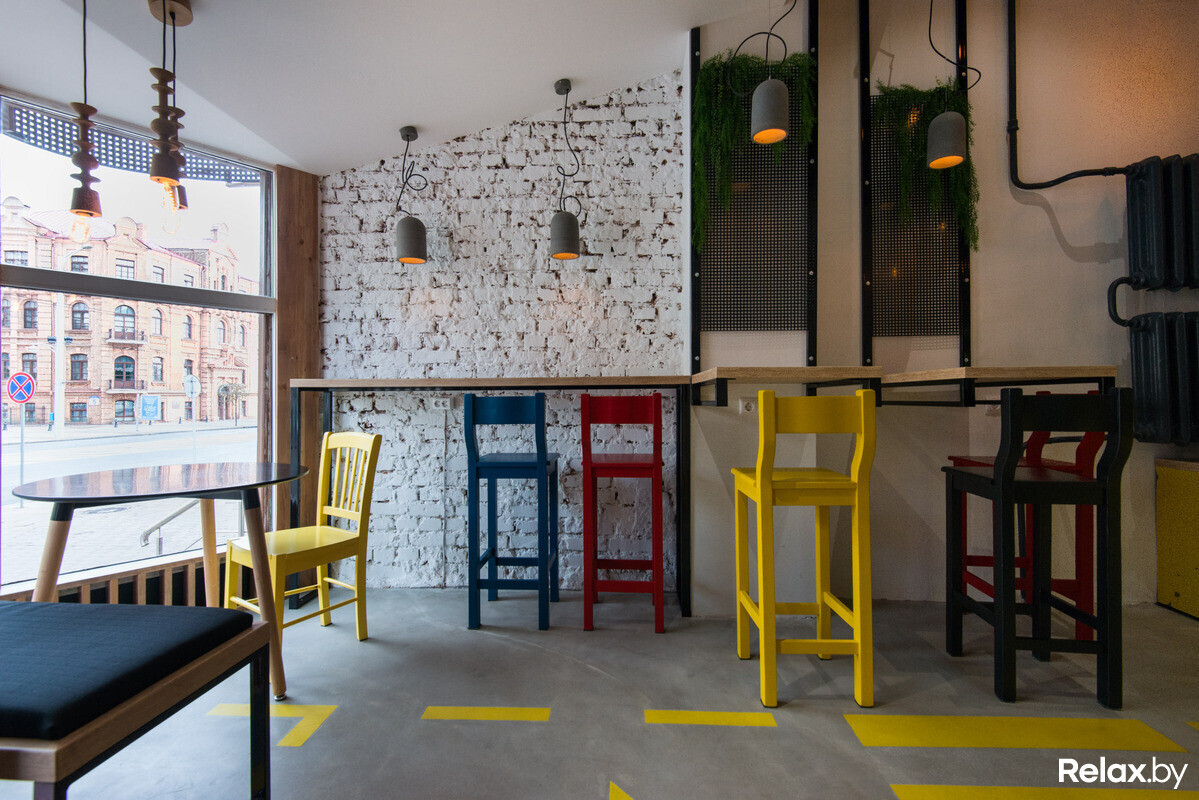 Над дизайном заведения работала известная белорусская архитектурная студия Zrobym architects: лофтовый стиль разбавили современными элементами декора и яркими цветовыми решениями; большая часть мебели — авторская. Разместиться предложат за низким или высоким столом или неконтактной стойкой; в компактной кофейне смогут расположиться 12 гостей.