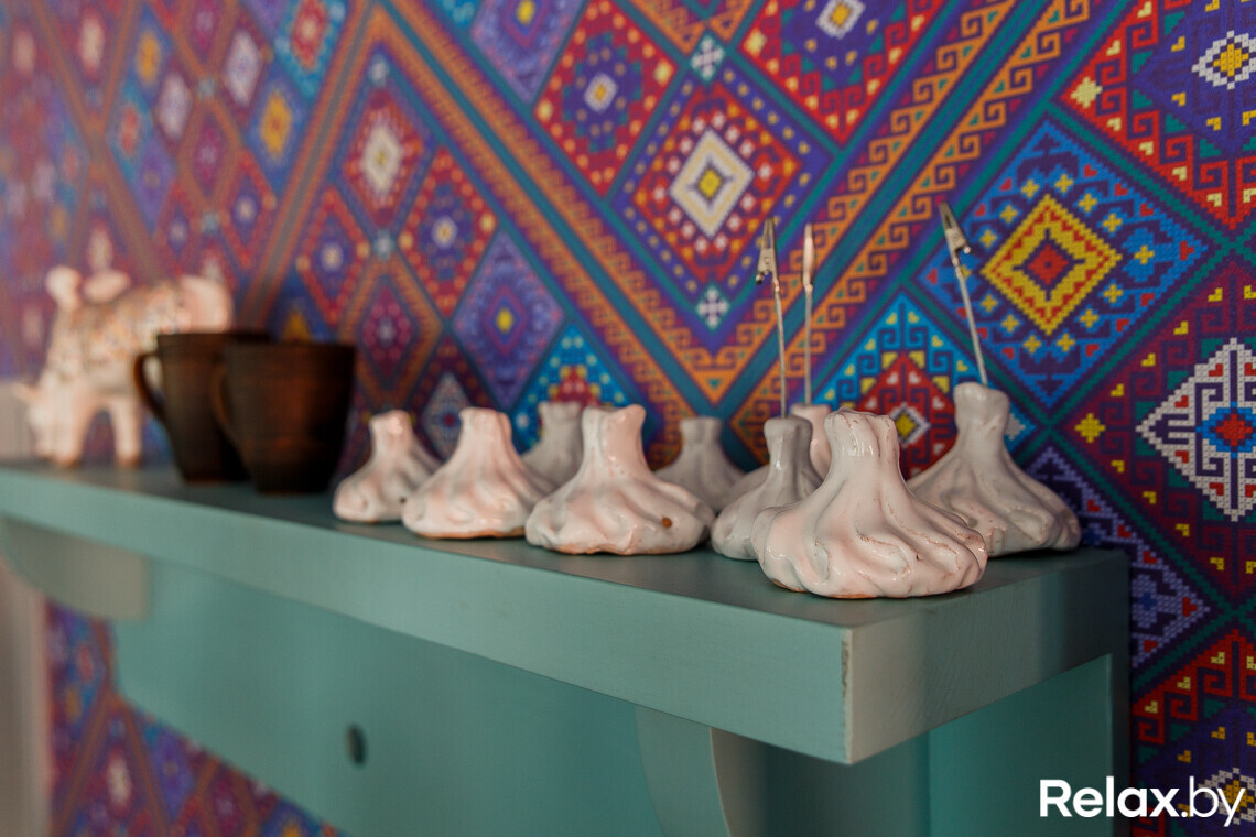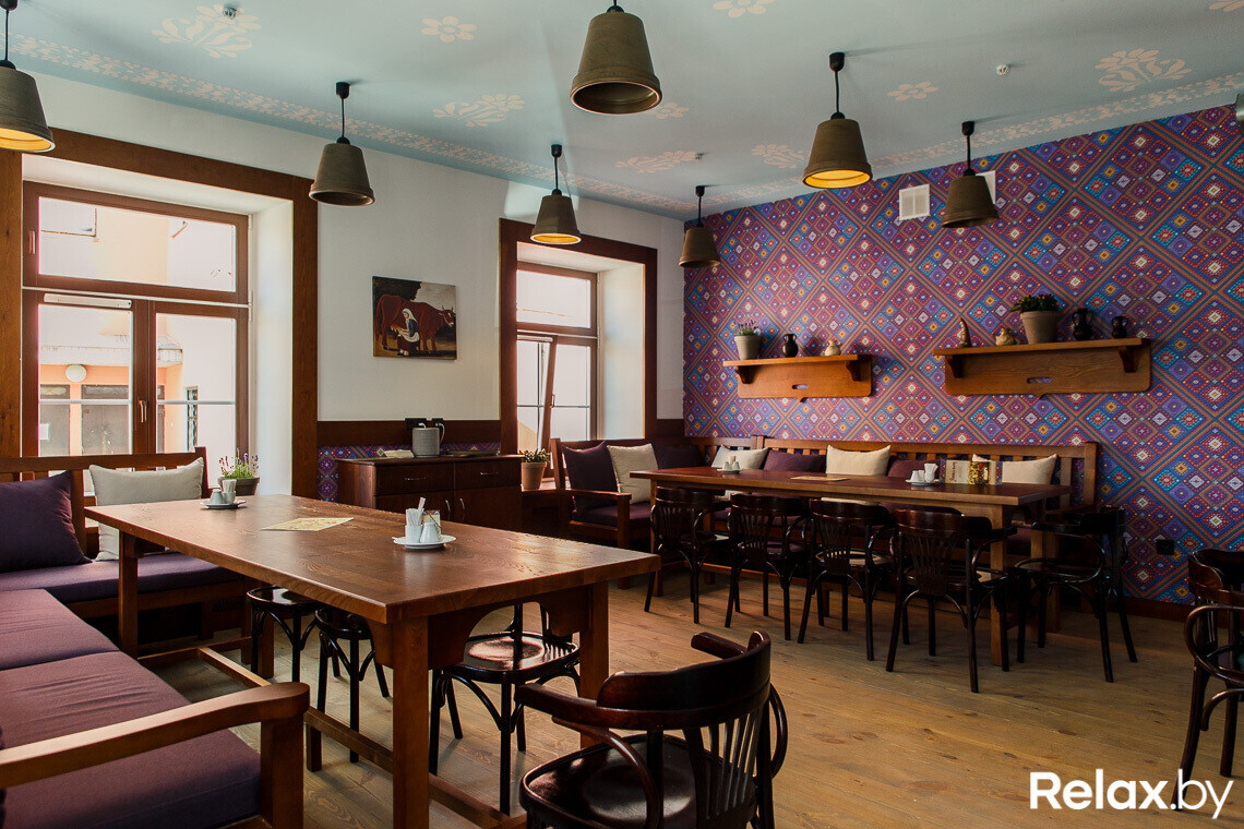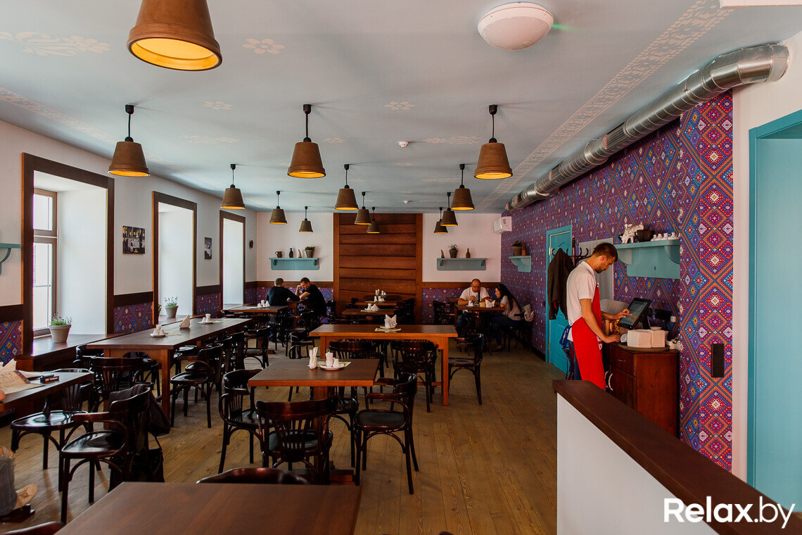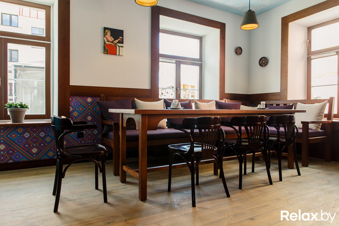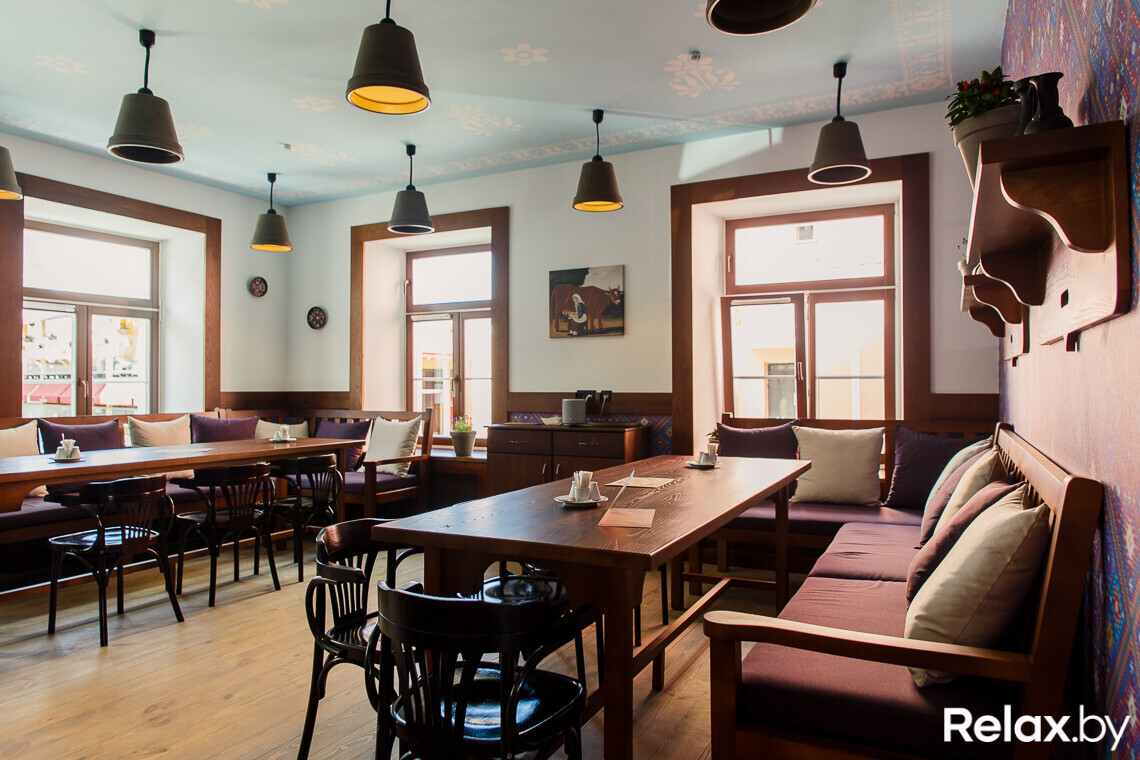 Интерьер заведения довольно простой, стремящийся к минимализму. Светлые потолки и стены контрастируют с темным деревом, которого здесь довольно много. Использованные в оформлении цветные узоры подчеркивают национальный колорит ресторана. Картины на стенах также призваны создать атмосферу Грузии в центре Минска.