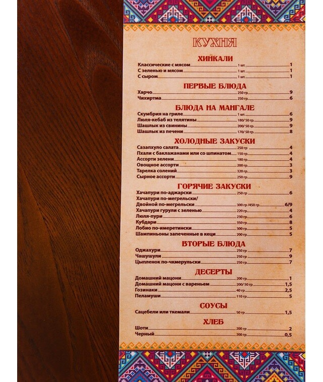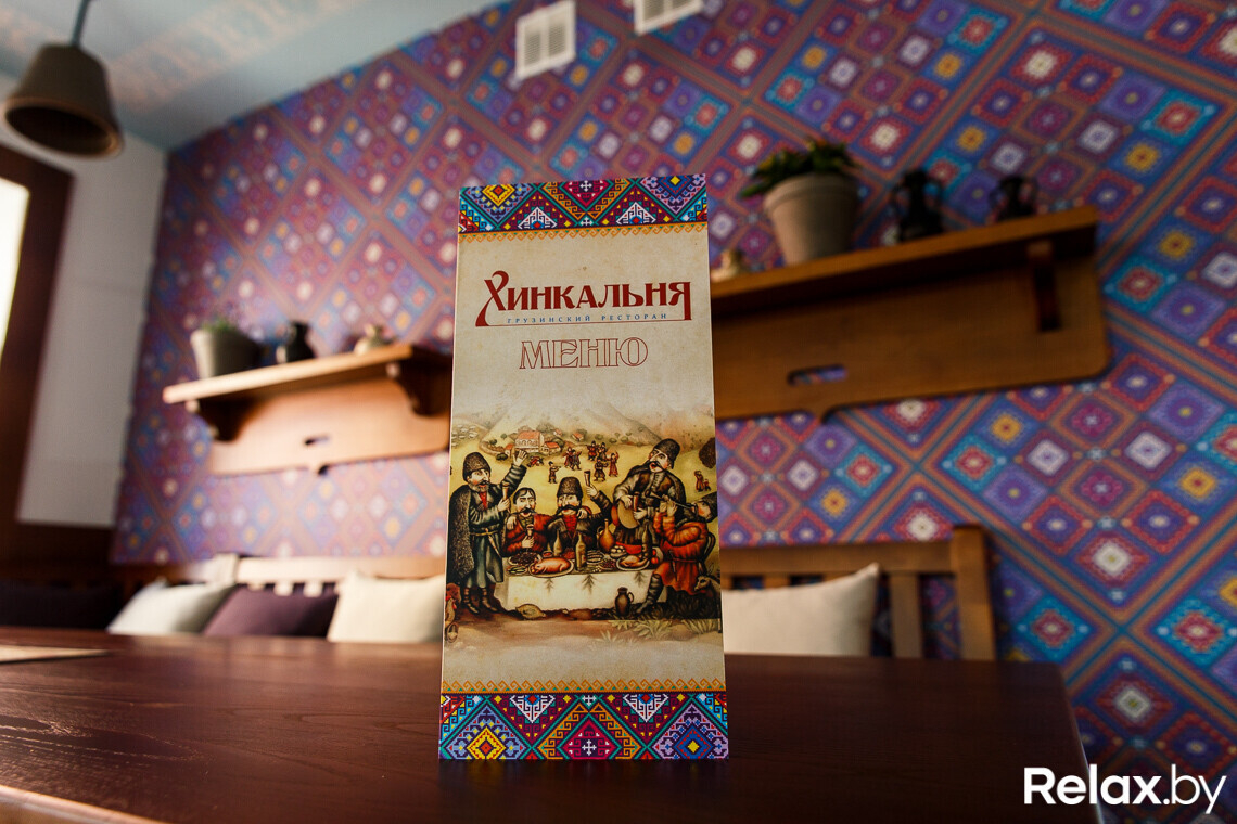 Визитная карточка заведения — хинкали. Здесь предлагают классические с мясом, с мясом и зеленью и сыром. Помимо кавказских «пельменей», здесь подают шашлык, первые блюда, горячие и холодные закуски, многие из которых являются классикой грузинской кухни. Даже хлеб испечен по грузинским рецептам.