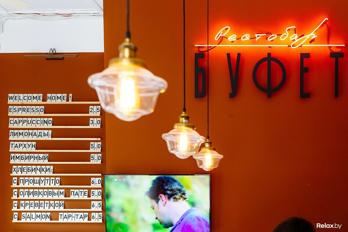 Интерьер в «Буфете» разработан дизайнером Ириной Налимовой, известной минчанам по знаковым местам столицы вроде Bistro de Luxe, Grand Cafе, News Cafe, Rosso, Tapas Bar и уже закрытому клубу Blondes and Brunettes.