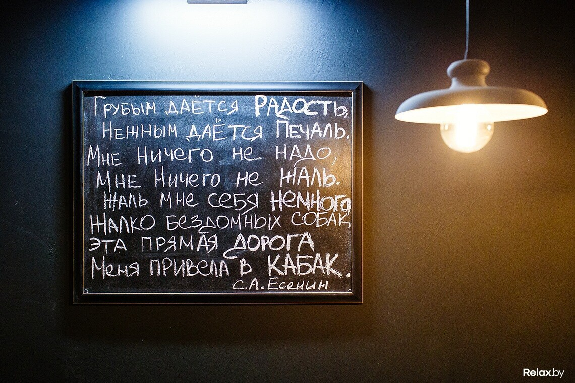 В барном меню найдутся домашнее вино и настойки, а также пиво и крепкий алкоголь; коктейли в него пока не включены, но опытные бармены могут приготовить практически любую классическую позицию.