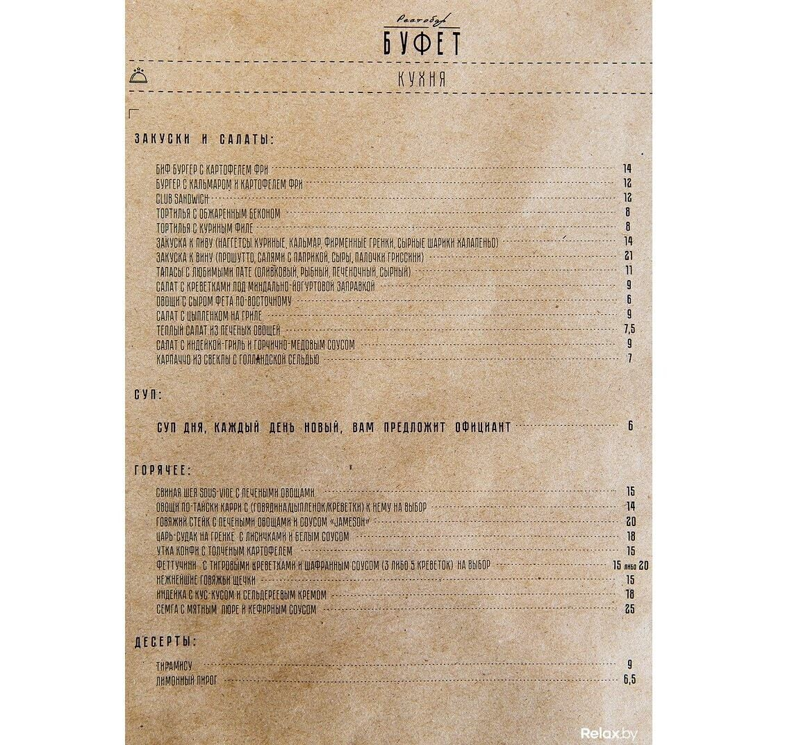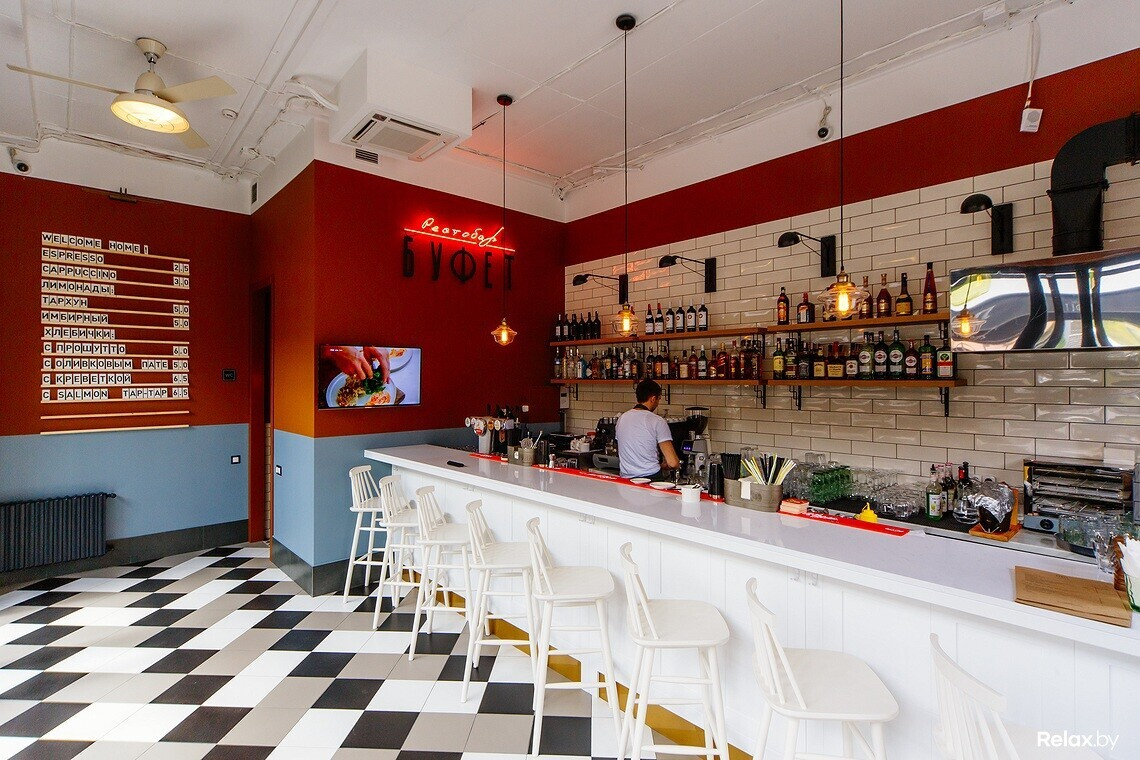В новый рестобар «Буфет» стоит идти за отдыхом разного формата и под разное настроение (а в перспективе — еще и за необычной арт-программой). В меню — европейские блюда, в баре — домашнее вино и настойки. Ценовой диапазон — средний. Дресс-код и фейс-контроль лояльный (но, конечно, для всеобщего удобства работает охрана). В «Буфете» не курят.