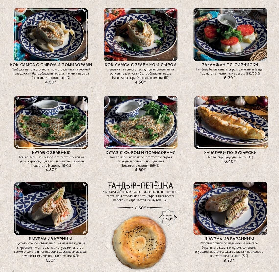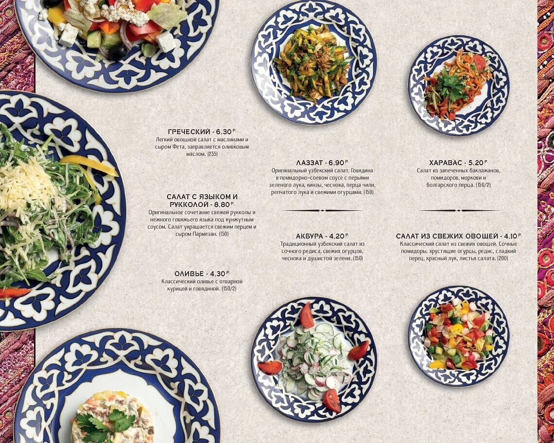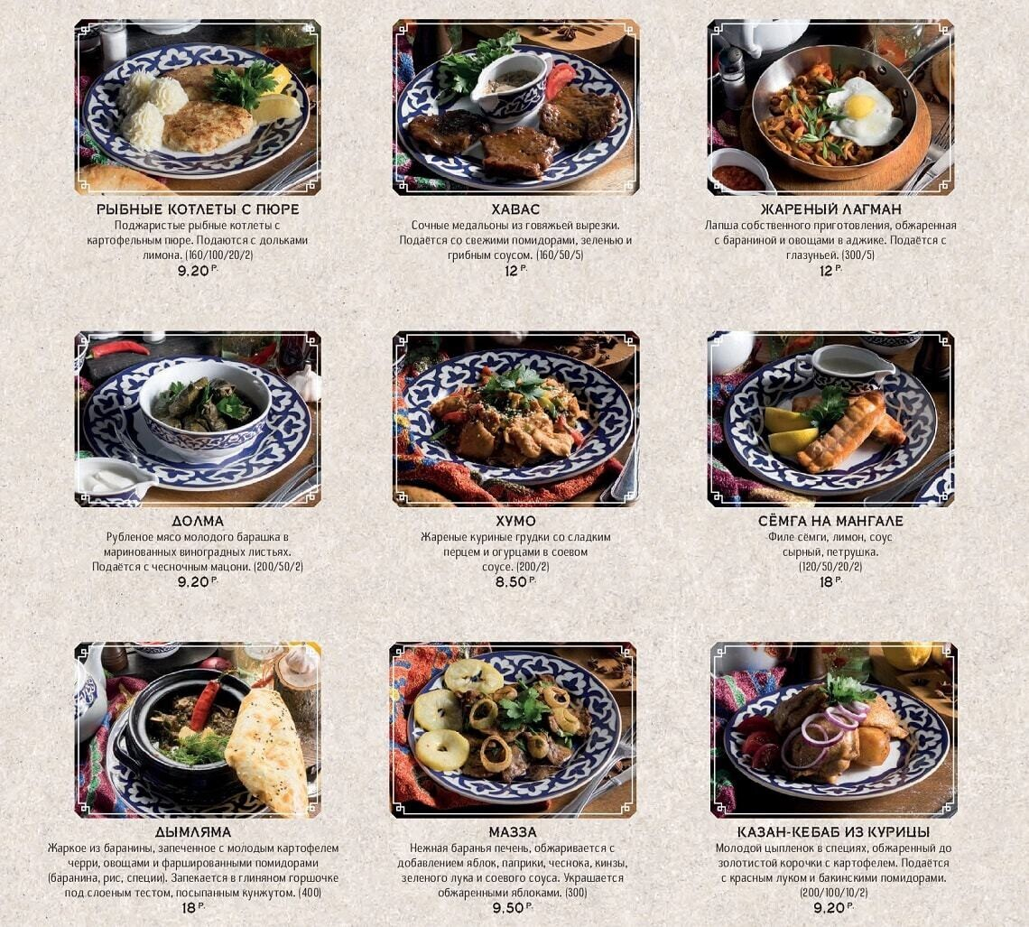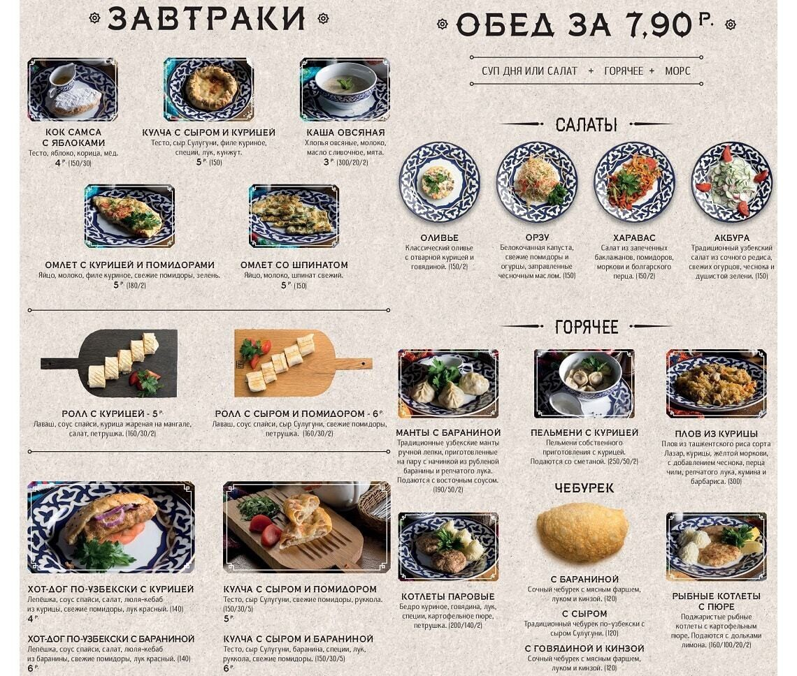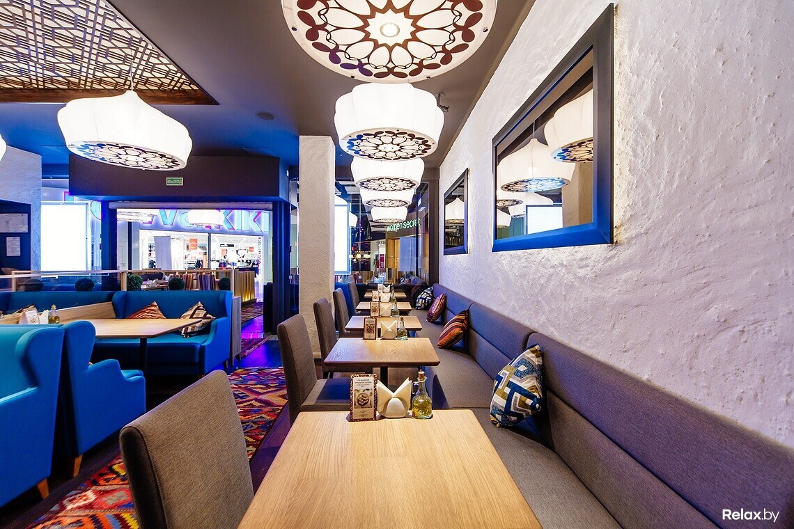 Восточная кухня знакома белорусам благодаря плову с бараниной и самсе. По словам создателей, заведение задумано душевным, даже «народным», и еда в нем главенствует надо всем остальным. Стоит отметить, что приготовление всех экзотических блюд доверили знатокам — поварам-профессионалам из Узбекистана. Для достижения оригинального вкуса многие продукты везут с Востока (от специй и сладких бакинских помидоров до специального сорта риса и халяльного мяса).