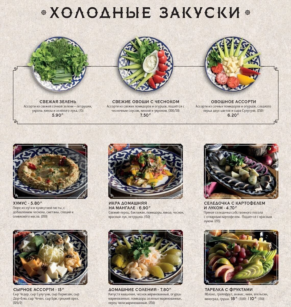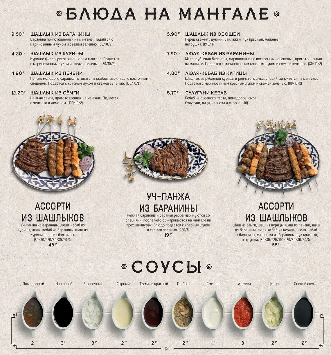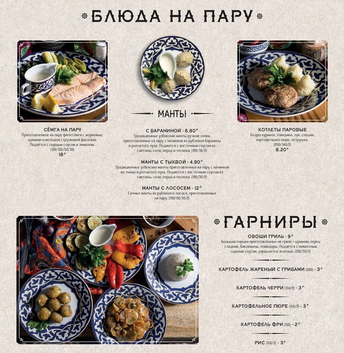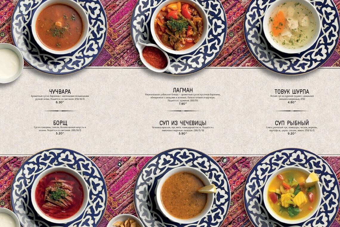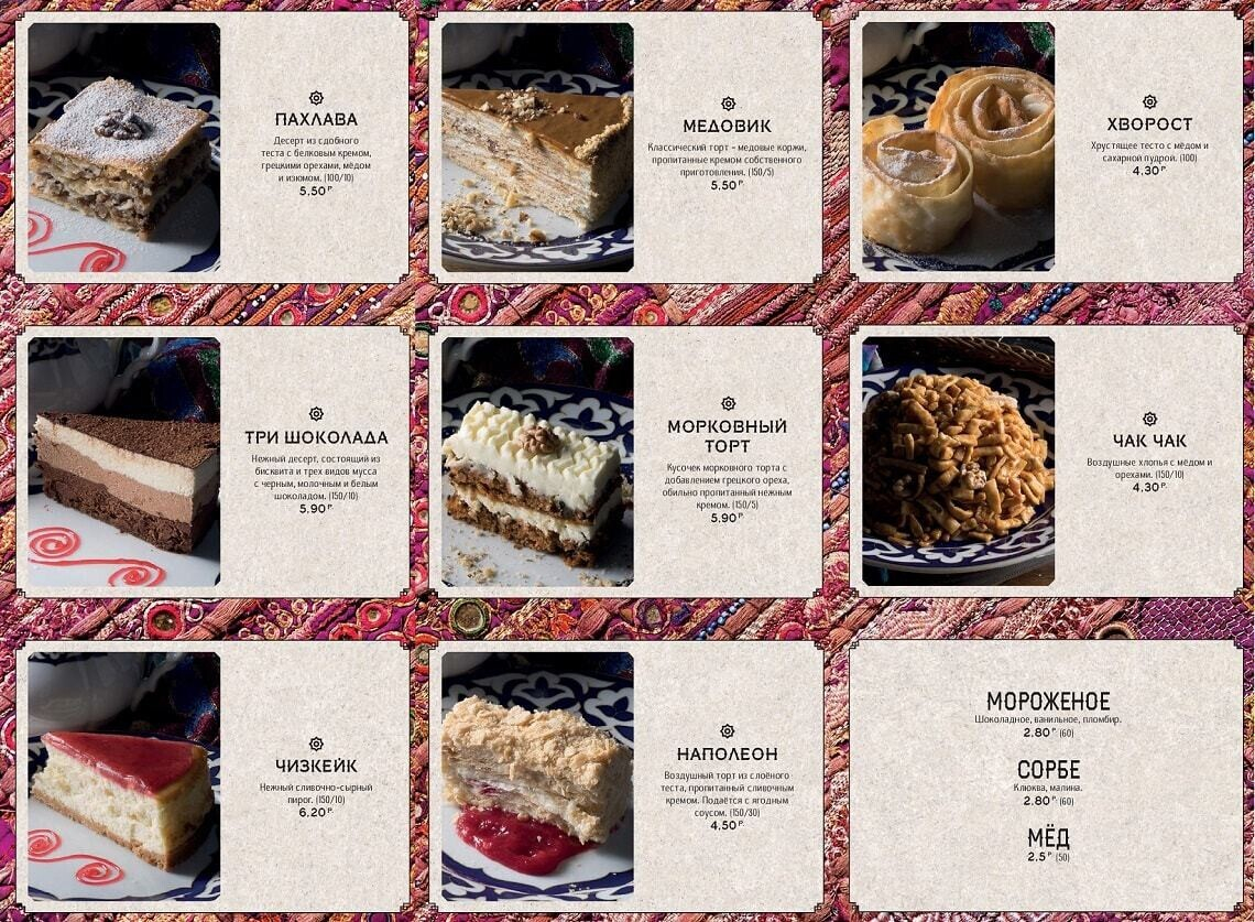 Восточная кухня знакома белорусам благодаря плову с бараниной и самсе. По словам создателей, заведение задумано душевным, даже «народным», и еда в нем главенствует надо всем остальным. Стоит отметить, что приготовление всех экзотических блюд доверили знатокам — поварам-профессионалам из Узбекистана. Для достижения оригинального вкуса многие продукты везут с Востока (от специй и сладких бакинских помидоров до специального сорта риса и халяльного мяса).