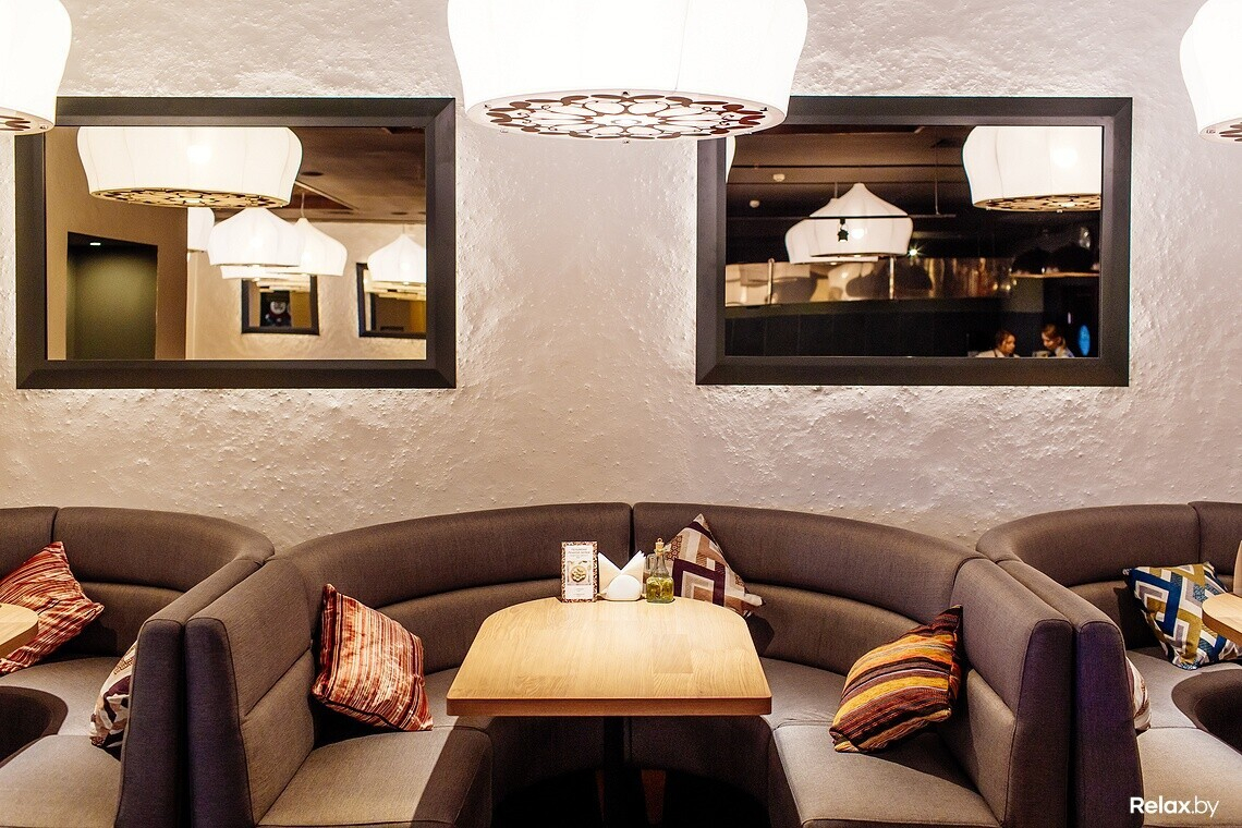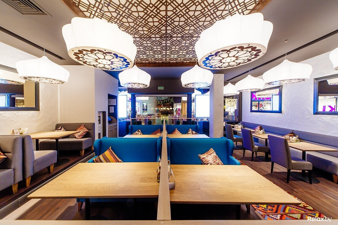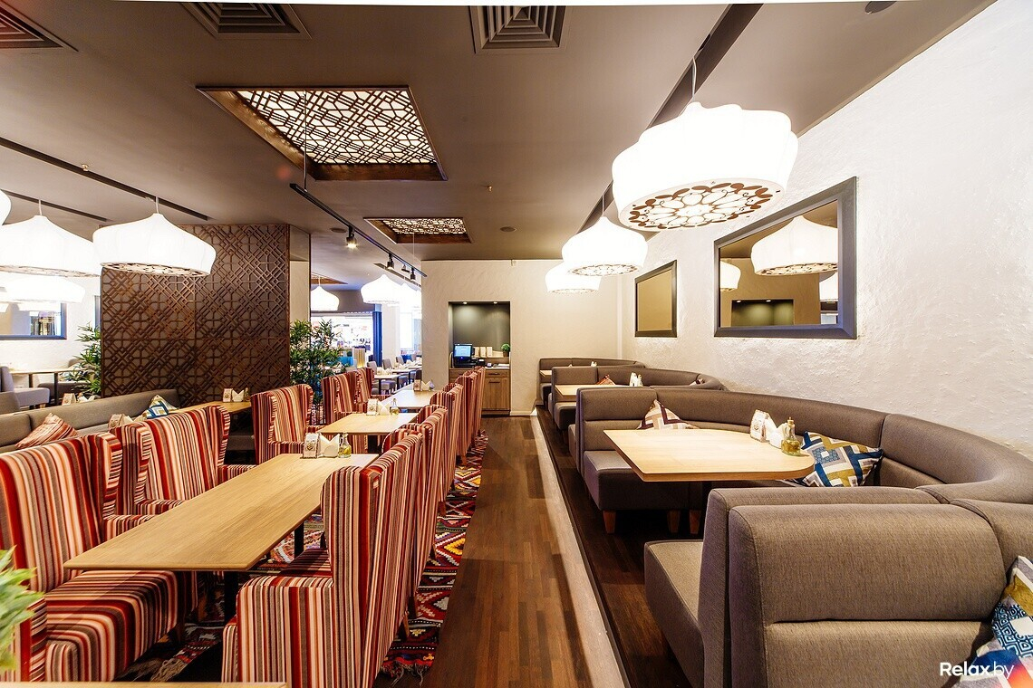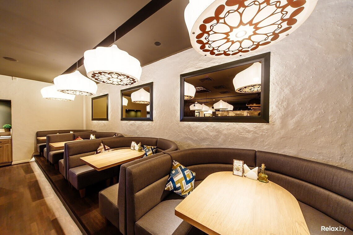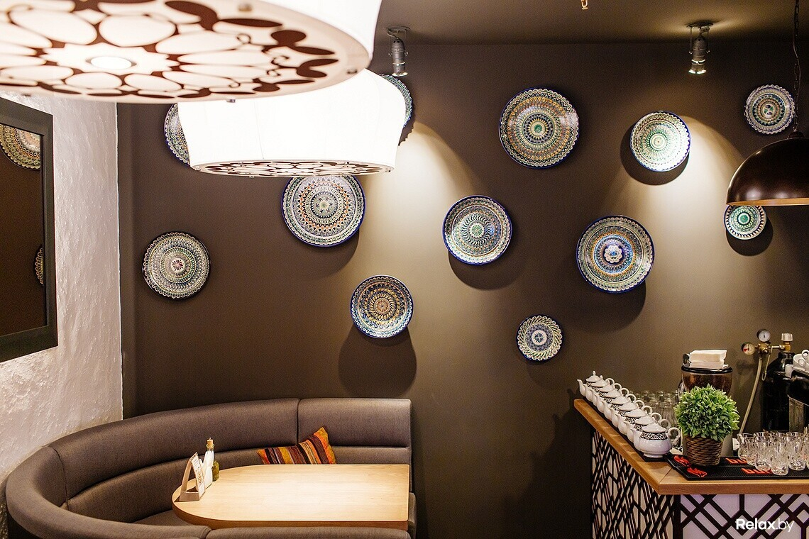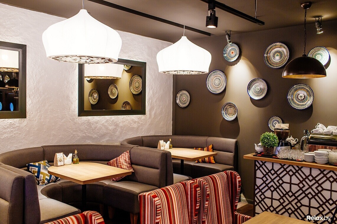 Интерьер нового места отличается от знакомых минских кафе с восточной кухней: нет такого обилия ярких красок и орнаментов, рисунков и росписей. Все сдержанно и лаконично, как говорят тут, «традиционный восточный шик уравновесили современной простотой». К слову, за приготовлением плова или лагмана в казанах и выпеканием лепешки в тандырной печи можно наблюдать, сидя за своим столиком.