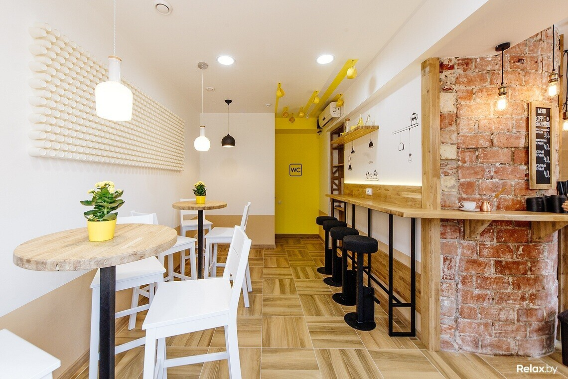 Интерьер заведения насыщен светлыми тонами и натуральным деревом. Есть круглые столики на две персоны, а напротив барная стойка с мягкими стульями. У окна места для тех, кто хочет провести время вдвоем. Для небольшой компании отведено место с диваном и креслом в конце зала. На стенах кофейни можно встретить интересные факты, например, одна из надписей гласит, что 1 октября отмечают День кофе в Японии, а другая — что в Нью-Йорке употребляют в 7 раз больше кофе, чем в любом другом мегаполисе.