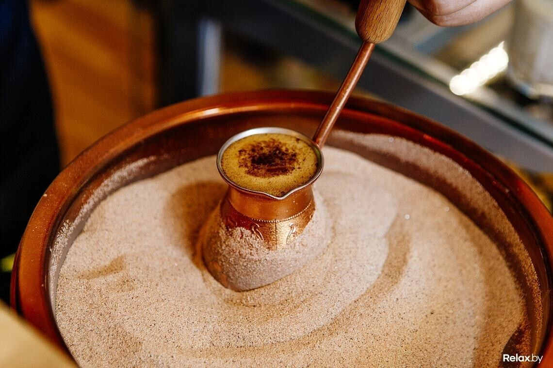 Фишкой кофейни можно назвать кофе по-восточному, который заваривается в турках. Стоимость такого классического восточного напитка — 3,50 рубля, а молочного, острого или ягодного — 4,50 рубля. Впрочем, стоимость многих кофейных напитков не превышает эту сумму, а цены начинаются с 2,5 рубля за эспрессо. В ассортименте также имеются американо, капучино, латте, хороший выбор чая и холодных напитков. Молочный коктейль и смузи стоят от 5 до 5,50 рублей в зависимости от объема. Добавки в кофе в виде молока, сиропа или сливок стоят по одному рублю.