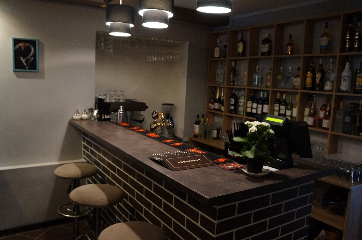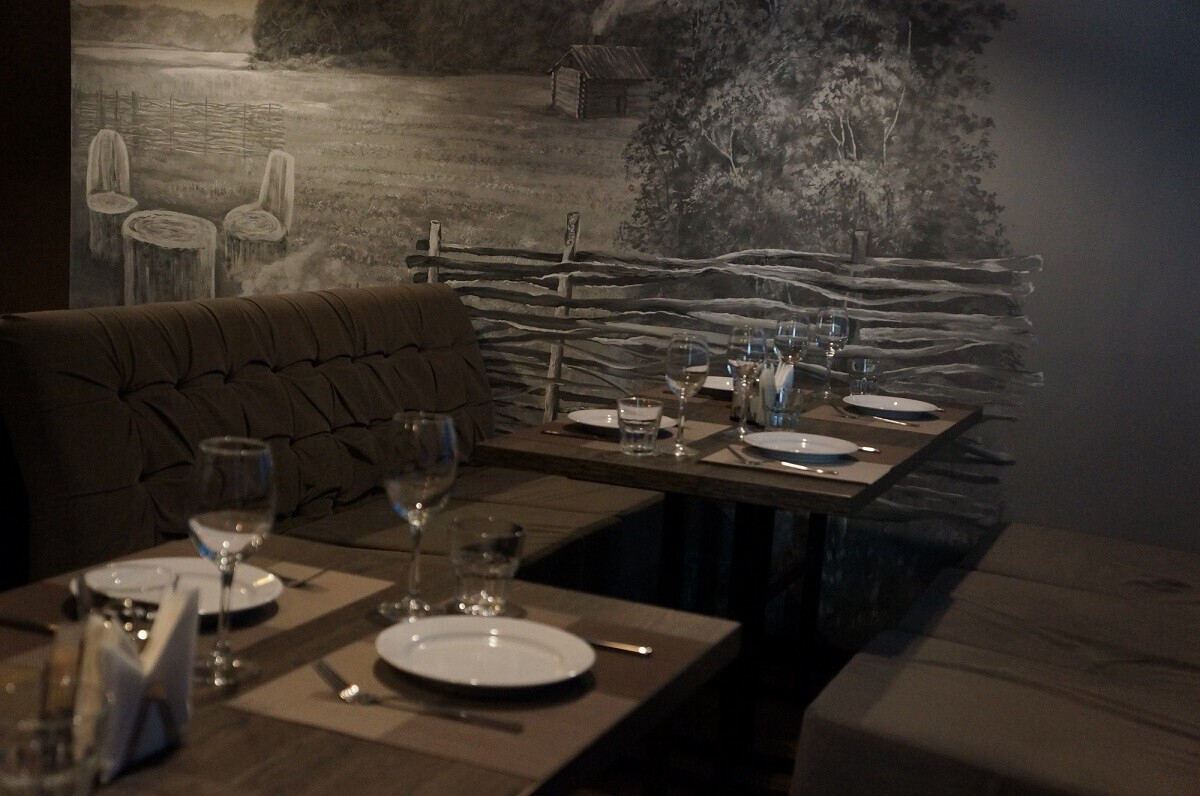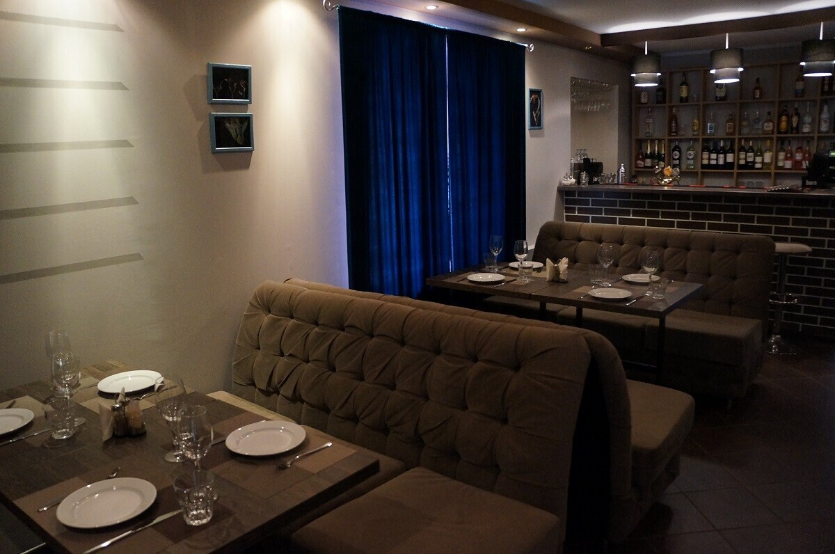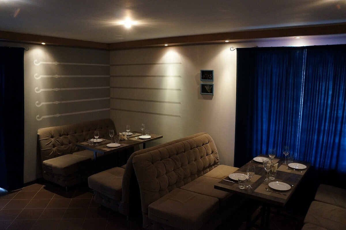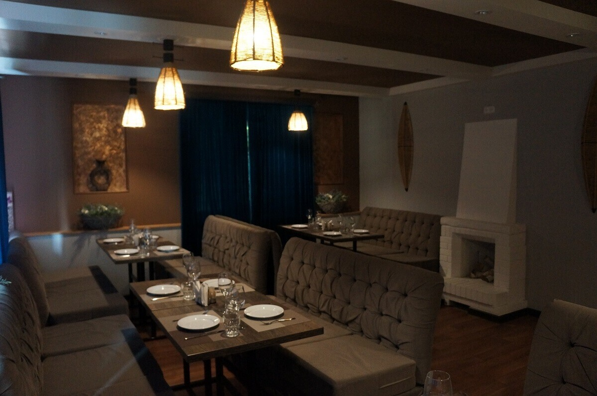 В новом ресторане 2 небольших зала, каждый из них рассчитан на 25-30 посетителей. Есть открытая летняя терраса, часть которой спрятана в тени виноградника. Над интерьером заведения работал приглашенный дизайнер. По его замыслу, в зале появились мягкие диваны и необычные авторские элементы.