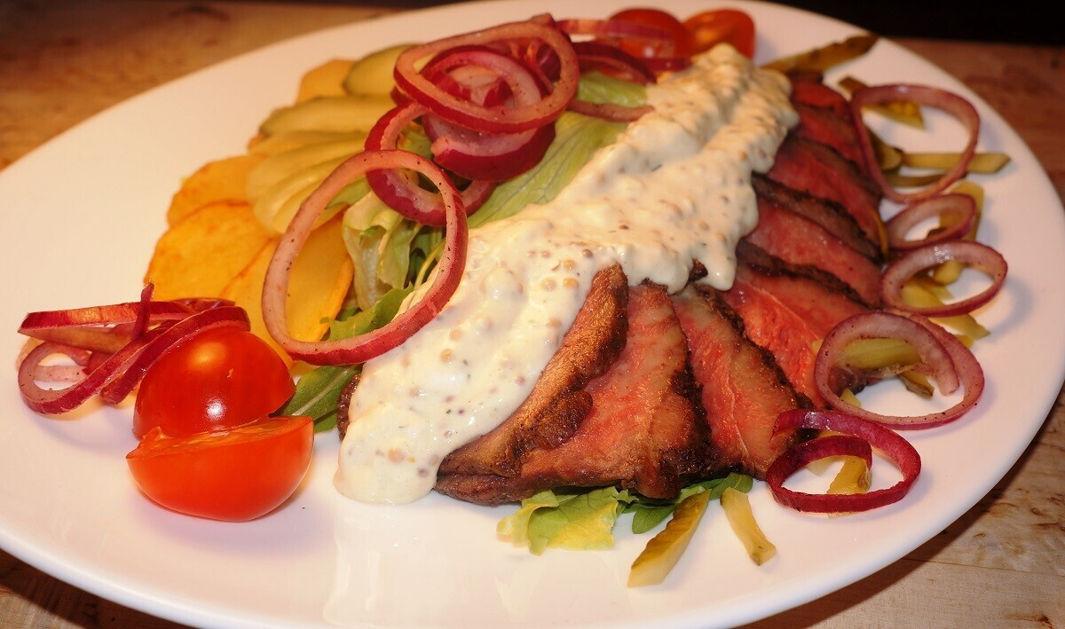 Все подается жареным на гриле: мясо, овощи, рыба, салаты с жареными на гриле ингредиентами. За основу блюд шеф-повар берет классические рецепты, а затем адаптирует их «под белорусские вкусы». В ассортименте можно найти алкогольные настойки собственного производства: «хреновуху», «вишневку», «клюквицу». Для детей есть отдельное меню.