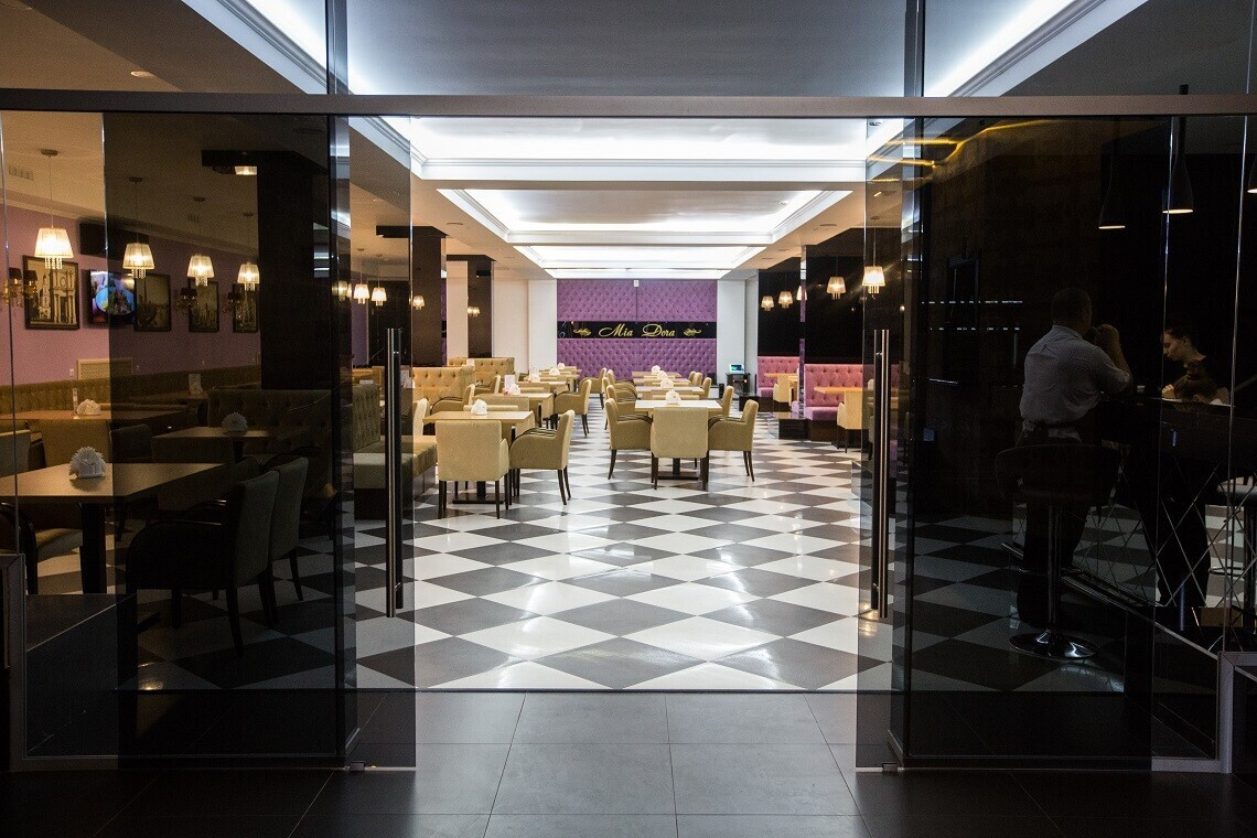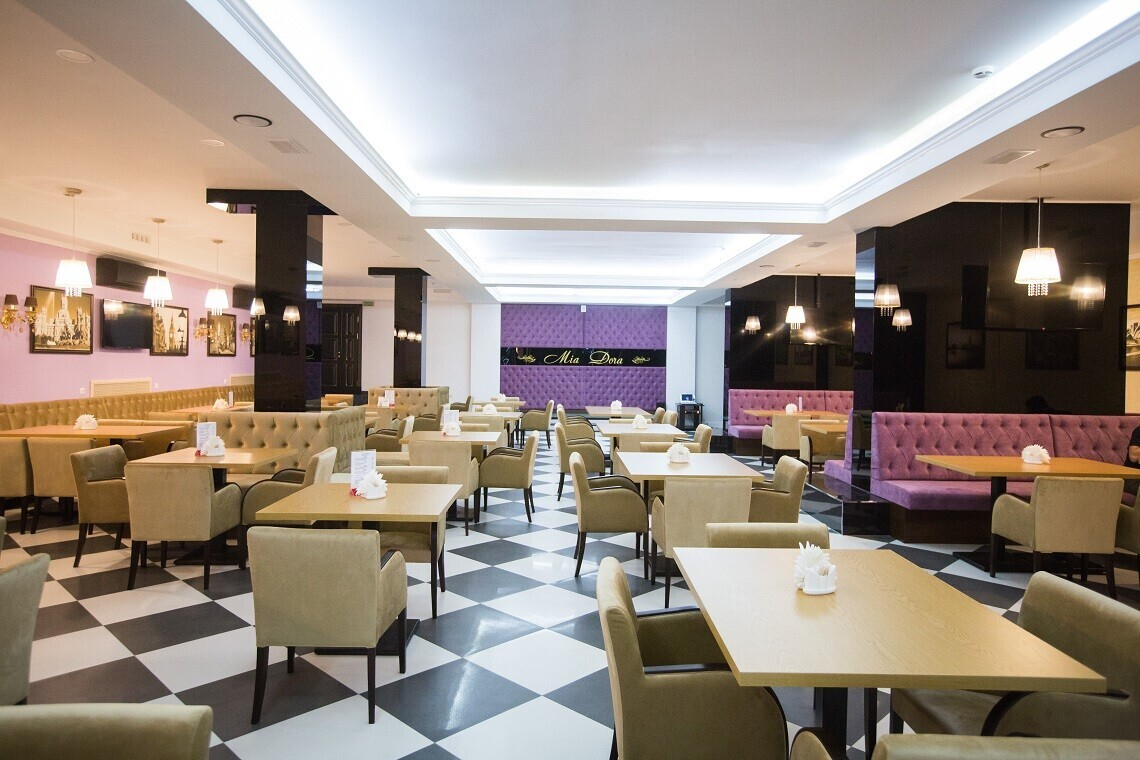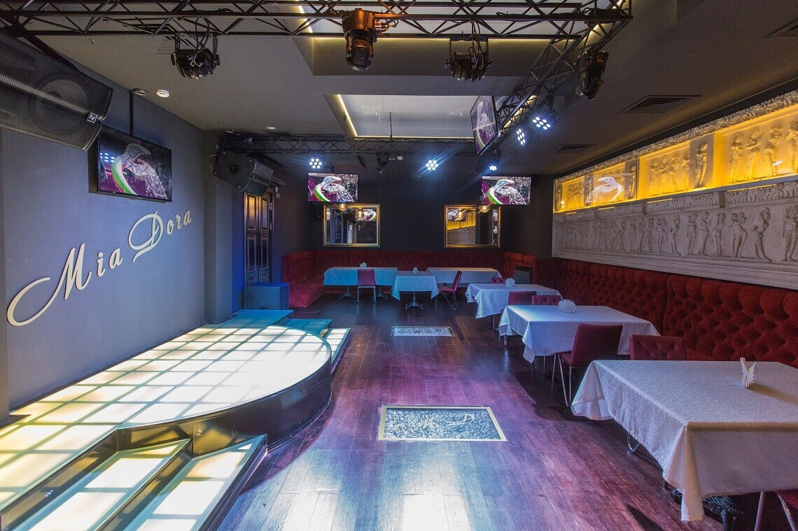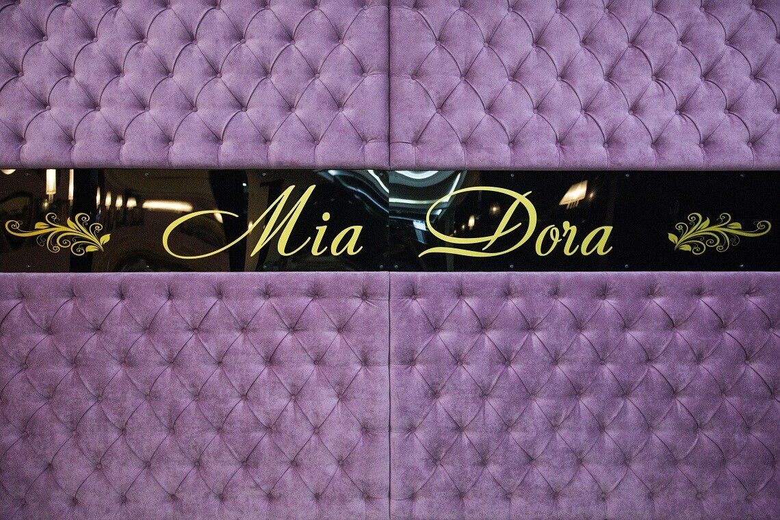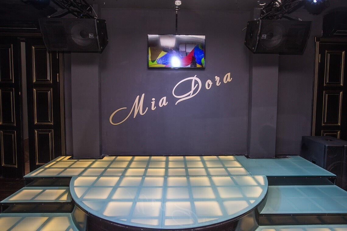 В Mia Dora два зала: большой обеденный и банкетный зал на 150-200 человек и караоке-зал на 45-50 посадочных мест. Банкетный зал выполнен в европейском стиле и светлых тонах. В зале звучит ненавязчивый лаунж.