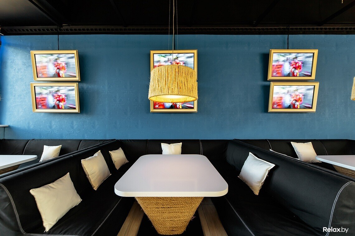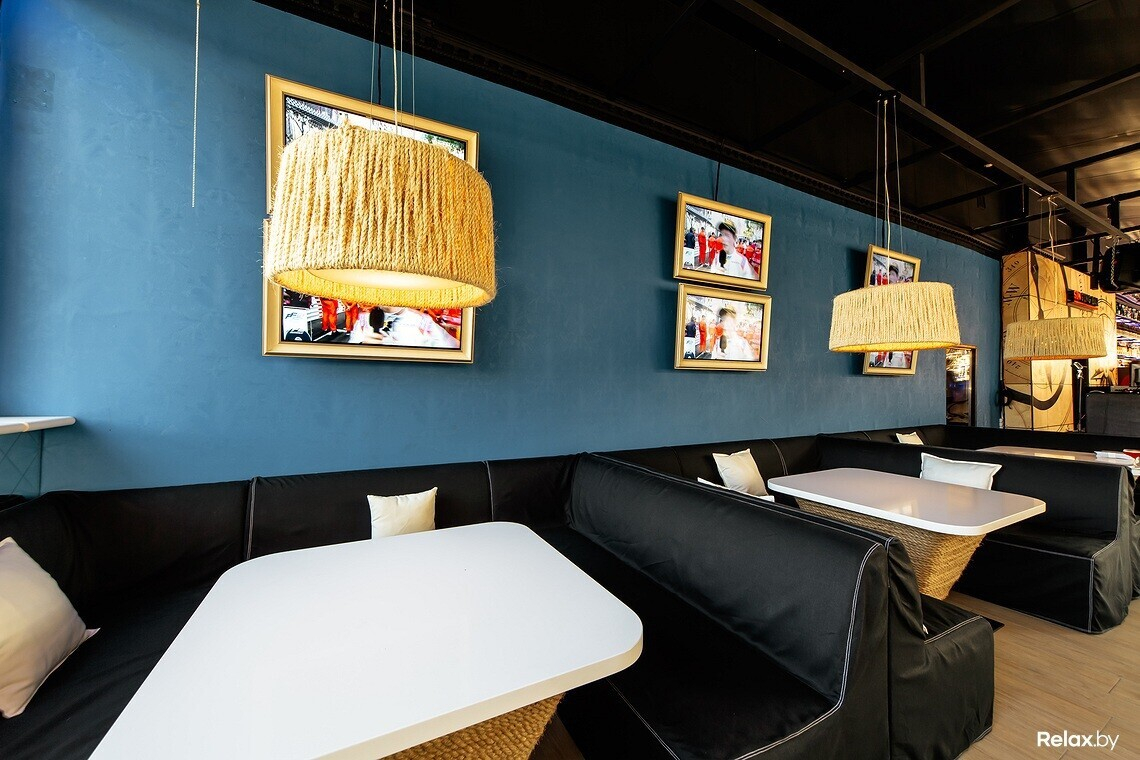 Здесь два зала, один из которых отведен под караоке. Музыка в залах играет разная, а благодаря качественной звукоизоляции звук не перекликается. В интерьере появились плетеные светильники, столики, удобные диваны и большое количество телевизоров для трансляции спортивных мероприятий.