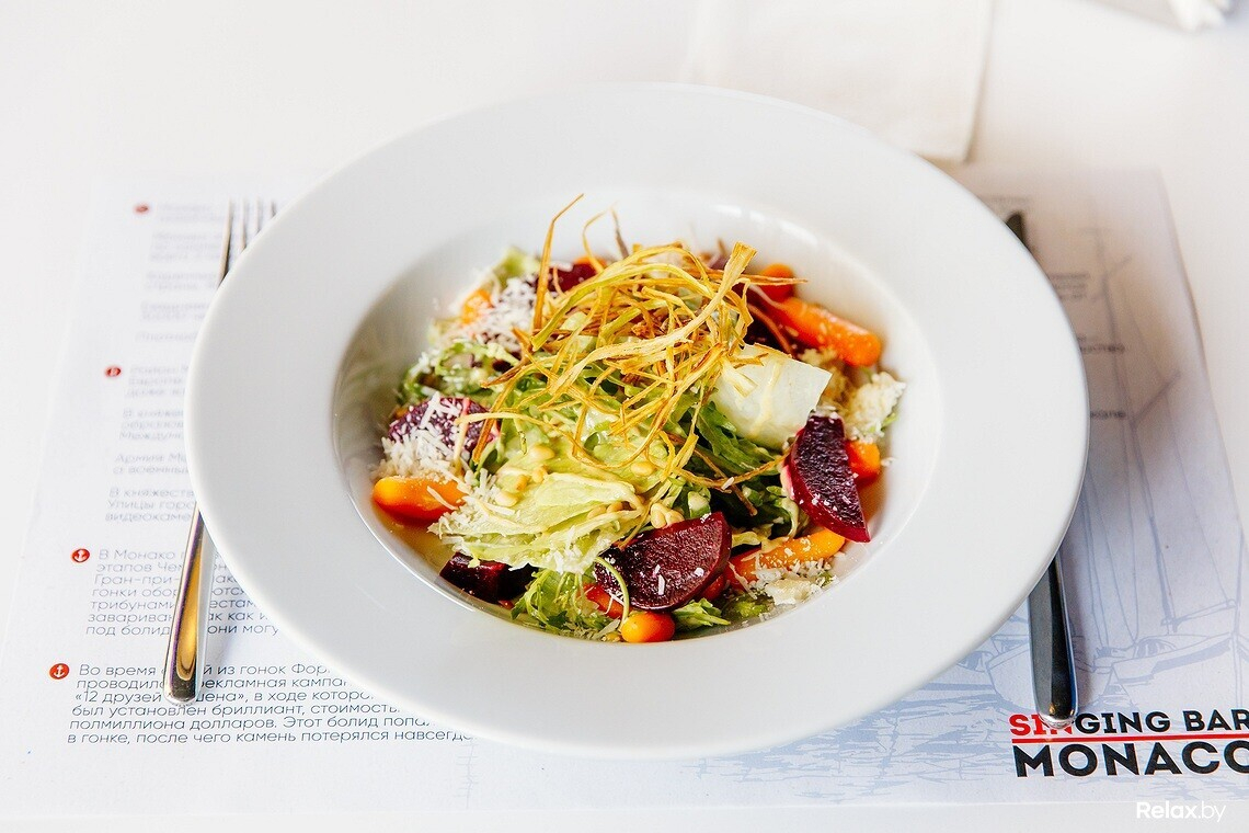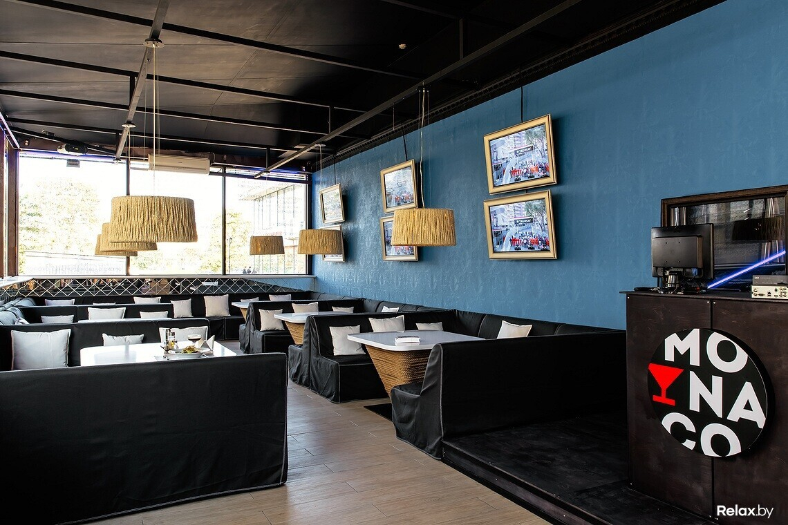 Кухня в заведении средиземноморская, но адаптированная под белорусские реалии. Было принято решение, что «Монако» будет напоминать ресторан на берегу курорта, но с приемлемыми ценами. Акцент, разумеется, сделан на бар. В «Монако» большая коктейльная карта, а также широкий выбор вин.