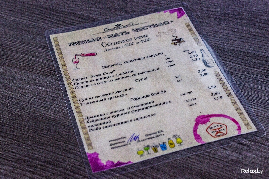 С 12:00 до 16:00 в «Мать честная» действует обеденное меню. На выбор предлагают несколько вариантов супов, горячих блюд и салатов. Каждое блюдо стоит 2-3 рубля. Причем горячее подается полноценным: не только мясо, но и гарнир. Со временем в заведении также появится детское меню с небольшими порциями пиццы, гамбургеров и другой «простой еды».