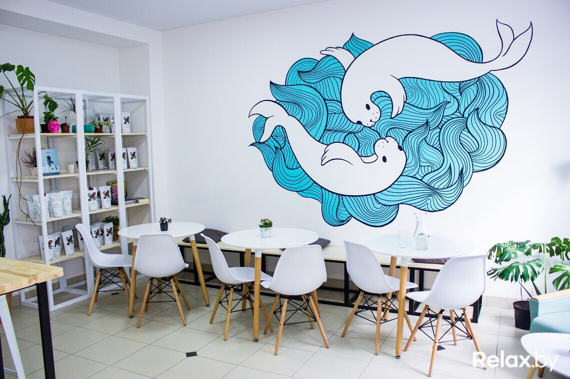 Интерьер кофейни выполнен в скандинавском стиле: светлые стены, лаконичный дизайн от стульев до барной стойки. На одной из стен изображены два тюленя. В заведении много зелени, часть цветов подарили гости и друзья на открытии кофейни.