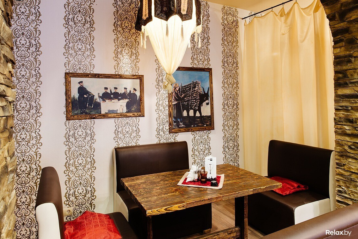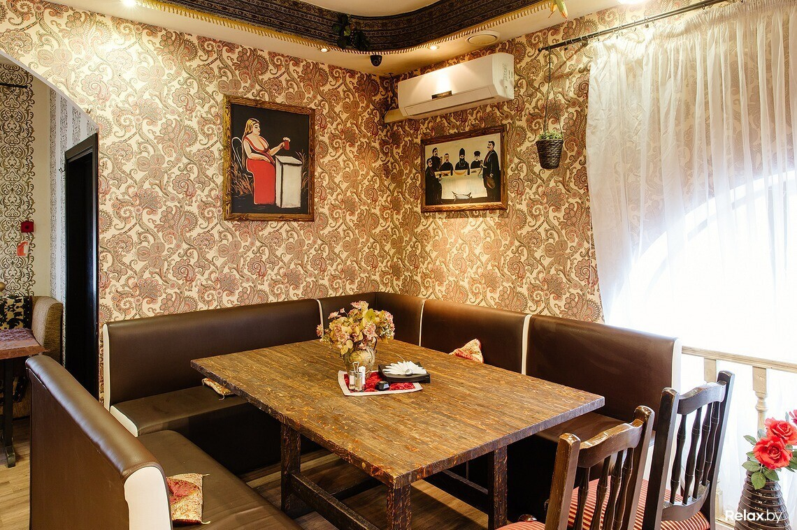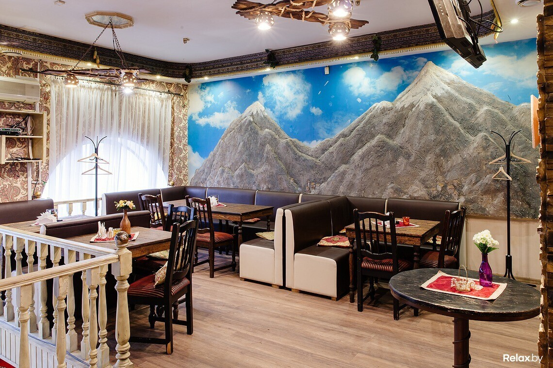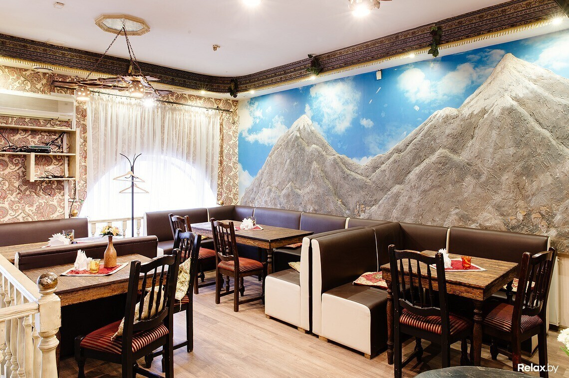В меню есть несколько вариантов шашлыка, хачапури, национальные супы и салаты, восточные соусы из аджики. Над блюдами работает профессиональный повар из Грузии. С 11:00 до 16:00 в кафе действует обеденное меню.