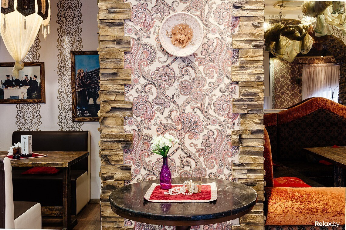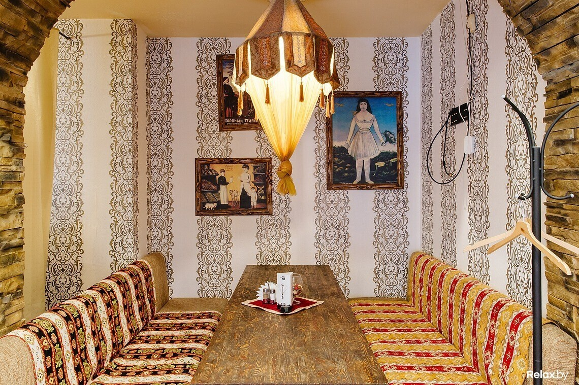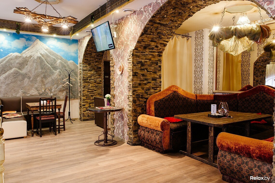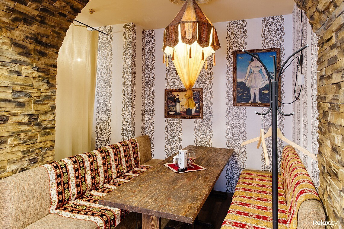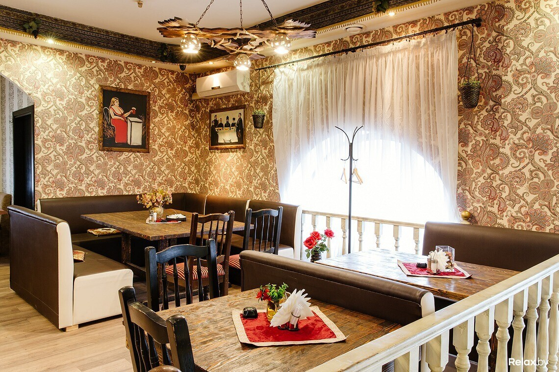 В меню есть несколько вариантов шашлыка, хачапури, национальные супы и салаты, восточные соусы из аджики. Над блюдами работает профессиональный повар из Грузии. С 11:00 до 16:00 в кафе действует обеденное меню.