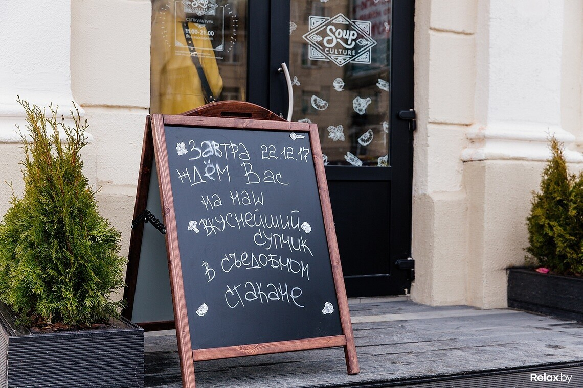 Цены: сырный суп в хлебном стаканчике в «Супкультуре» можно попробовать за 5 рублей, все остальные — за 4 рубля 50 копеек. Ежедневно после 19.00 в кафе действует 50% скидка на основные позиции в меню.
