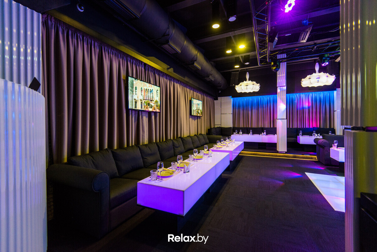 Интерьер зала сочетает домашнюю и клубную атмосферу. Гости могут расположиться на мягких диванах, а для тех, кто хочет стать звездой вечера, оборудована яркая сцена с микрофоном и подсветкой.