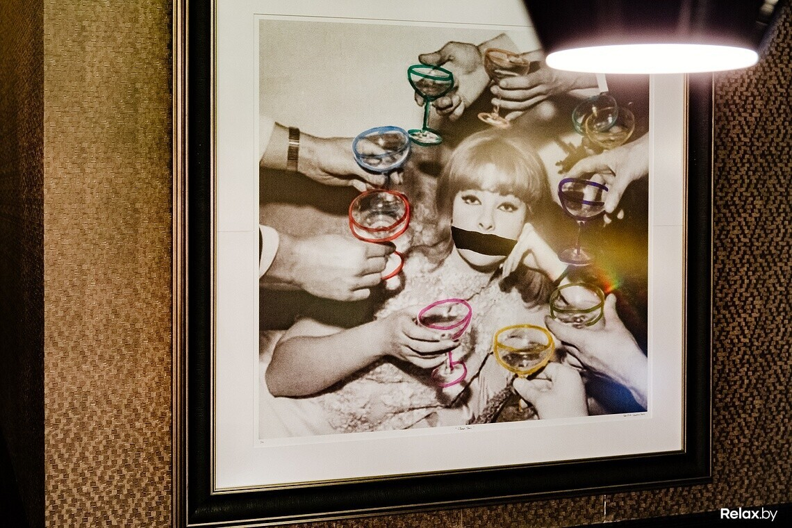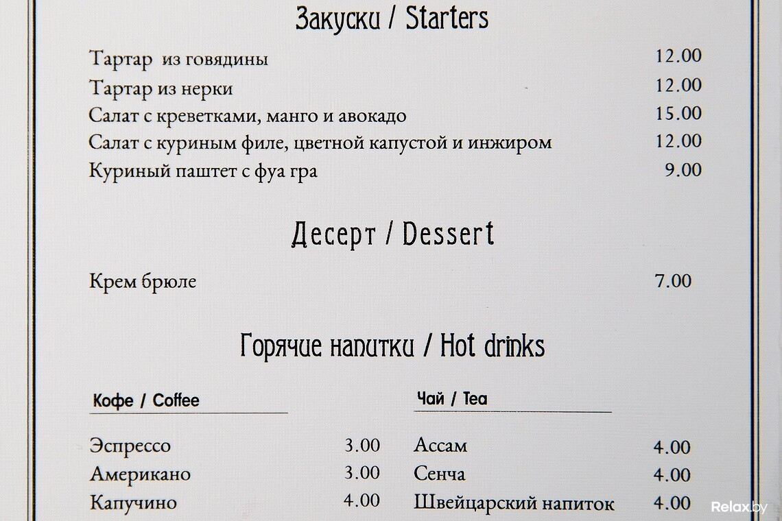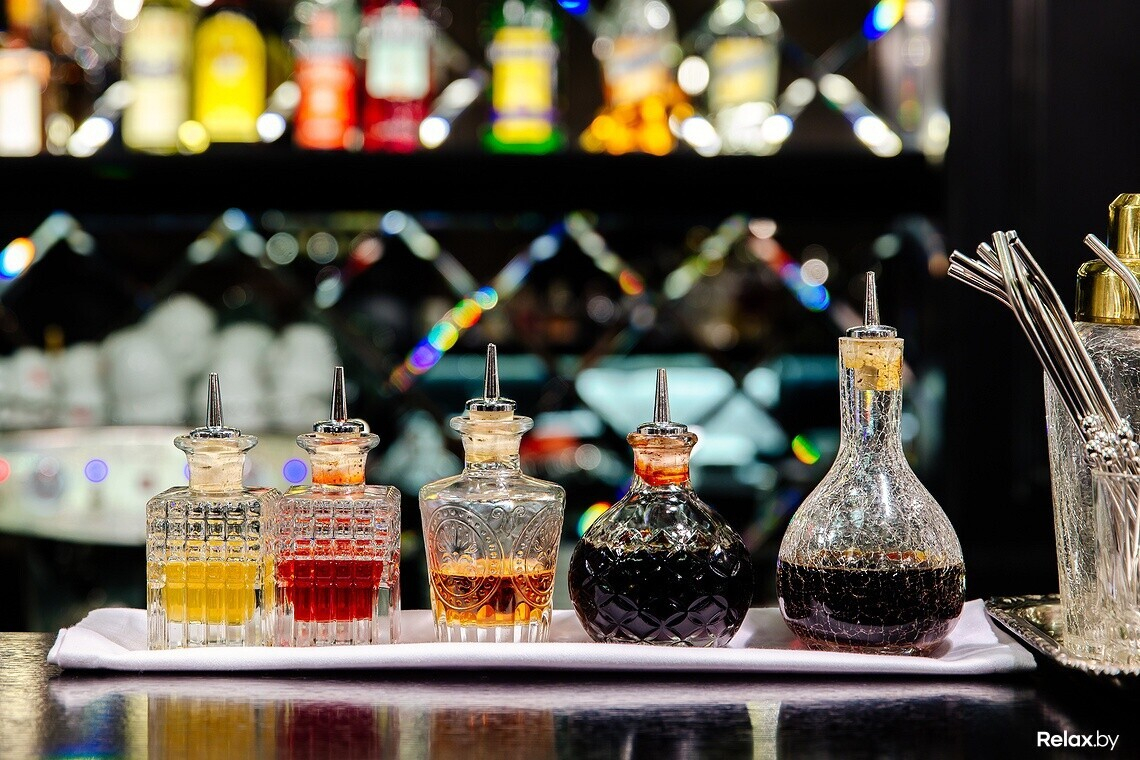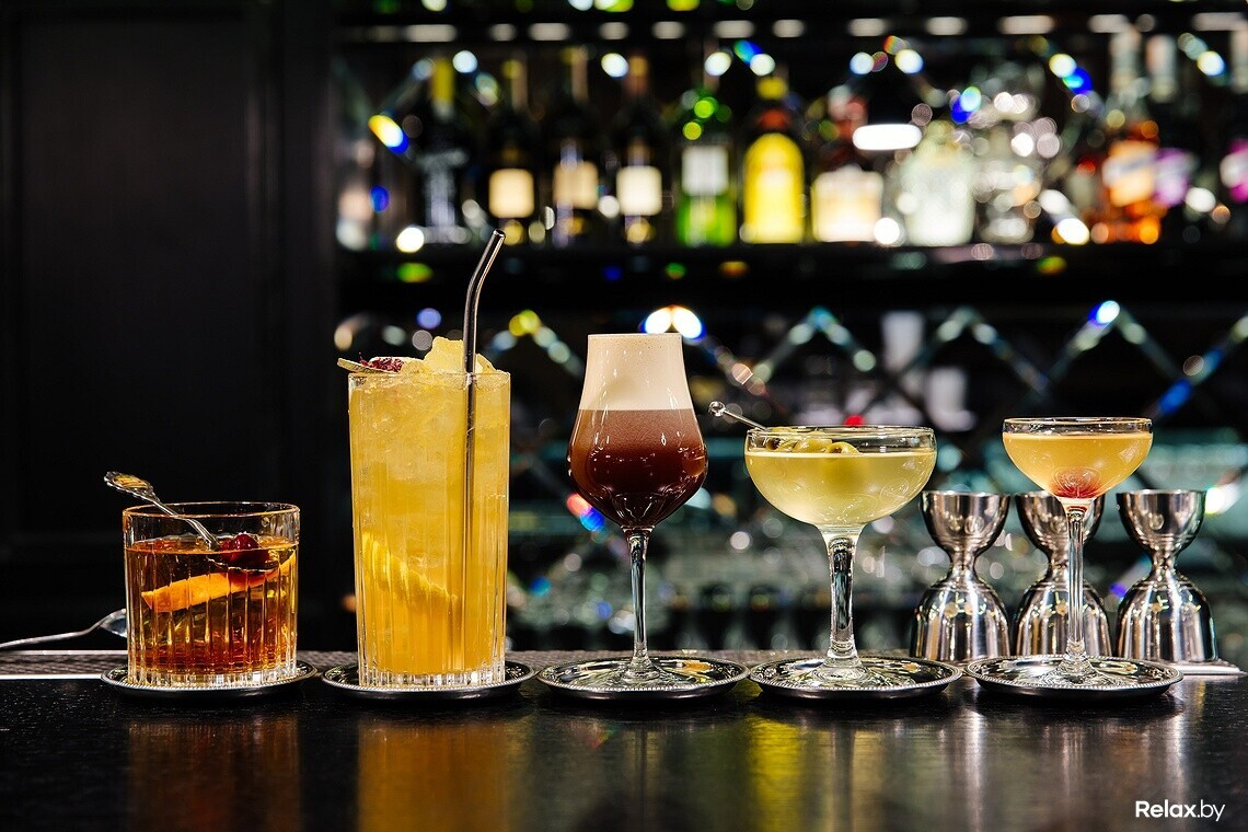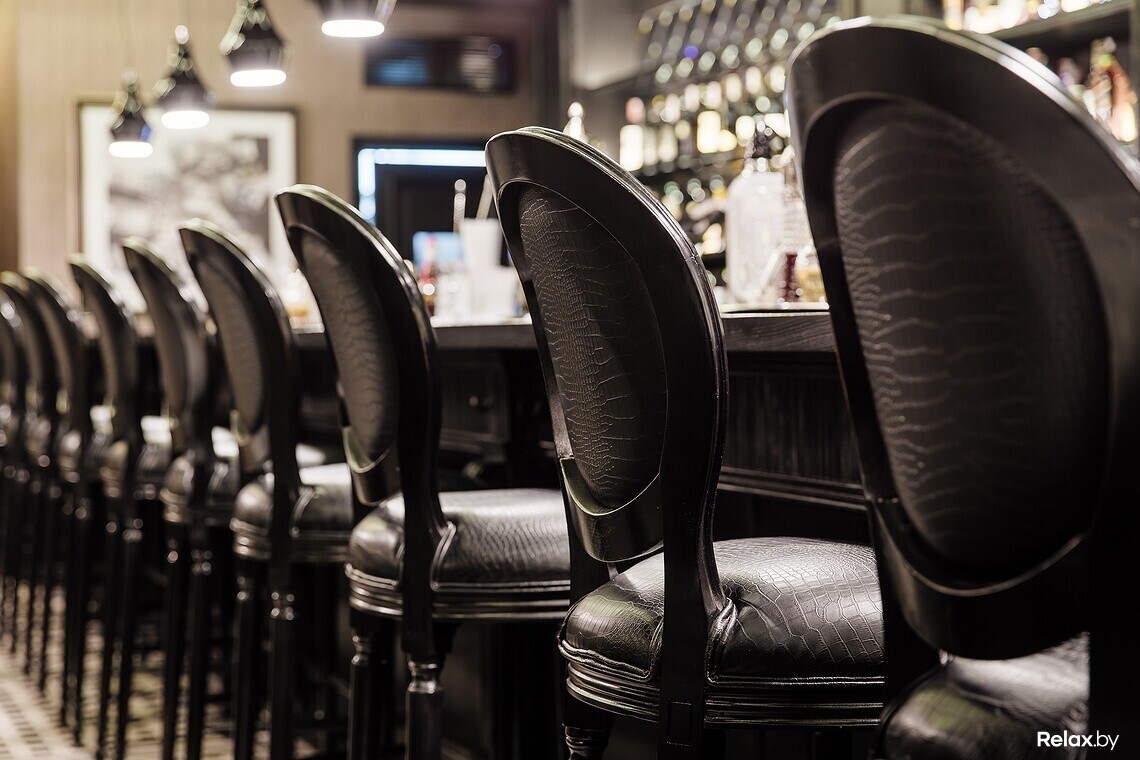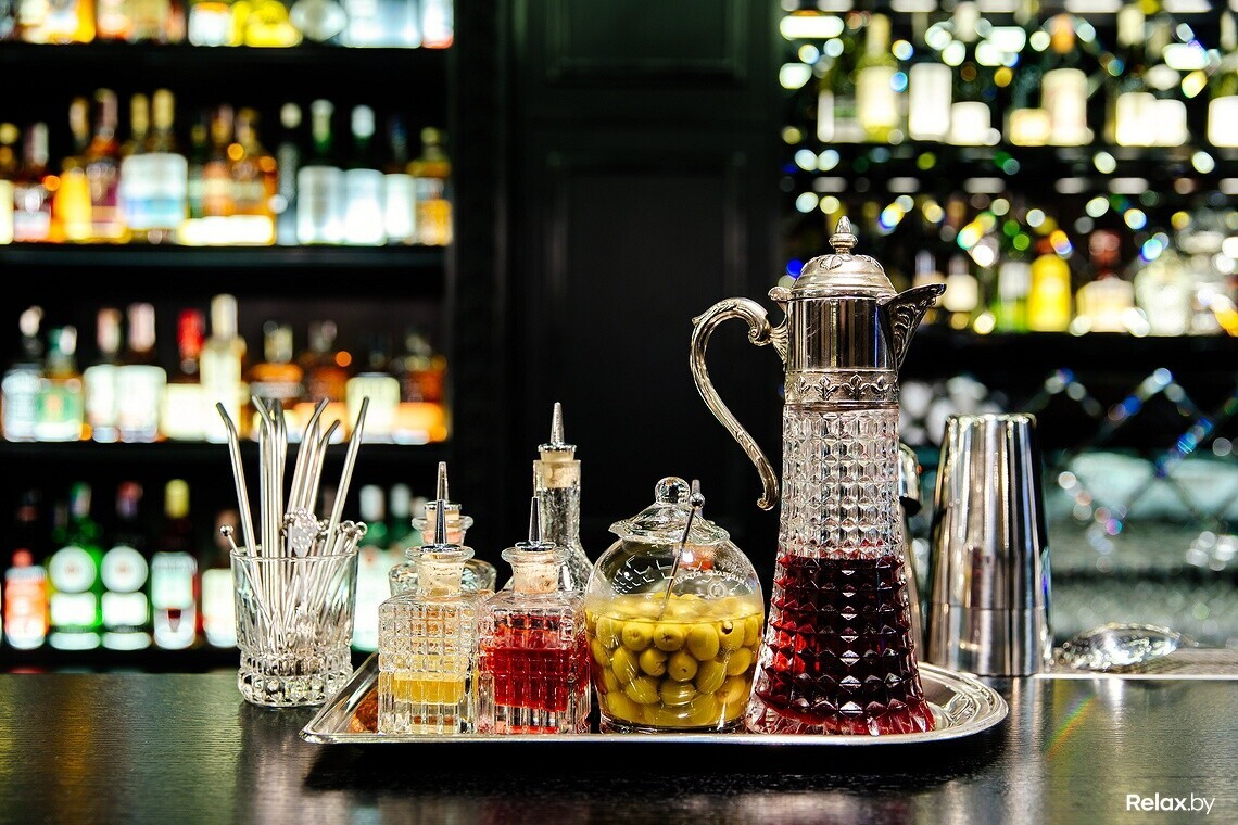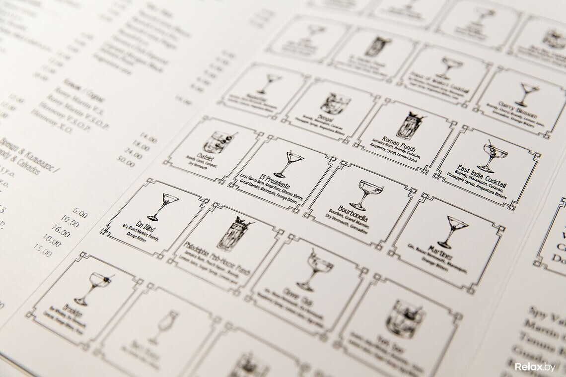 Меню бара — коктейльная классика, незаурядная винная карта, достойная подборка тихих и игристых вин, кухня — небольшое гастрономическое сопровождение к напиткам: салаты, тартары, пара десертов.