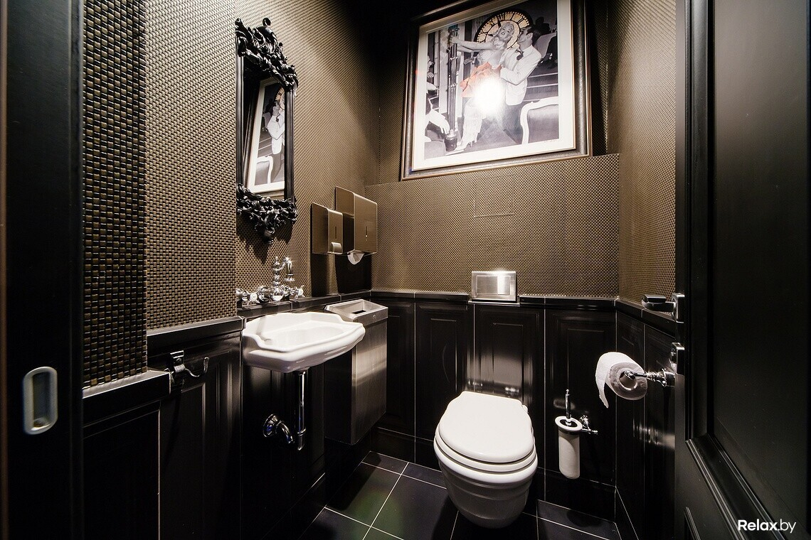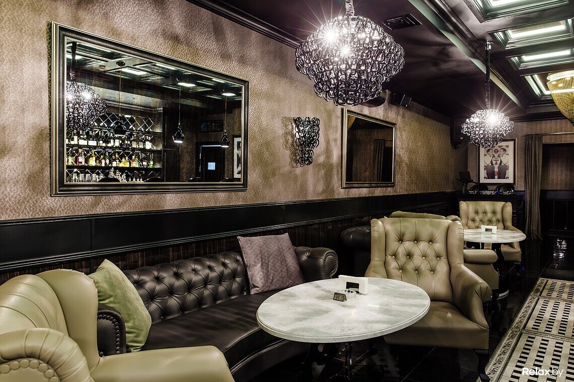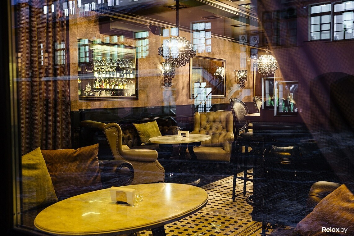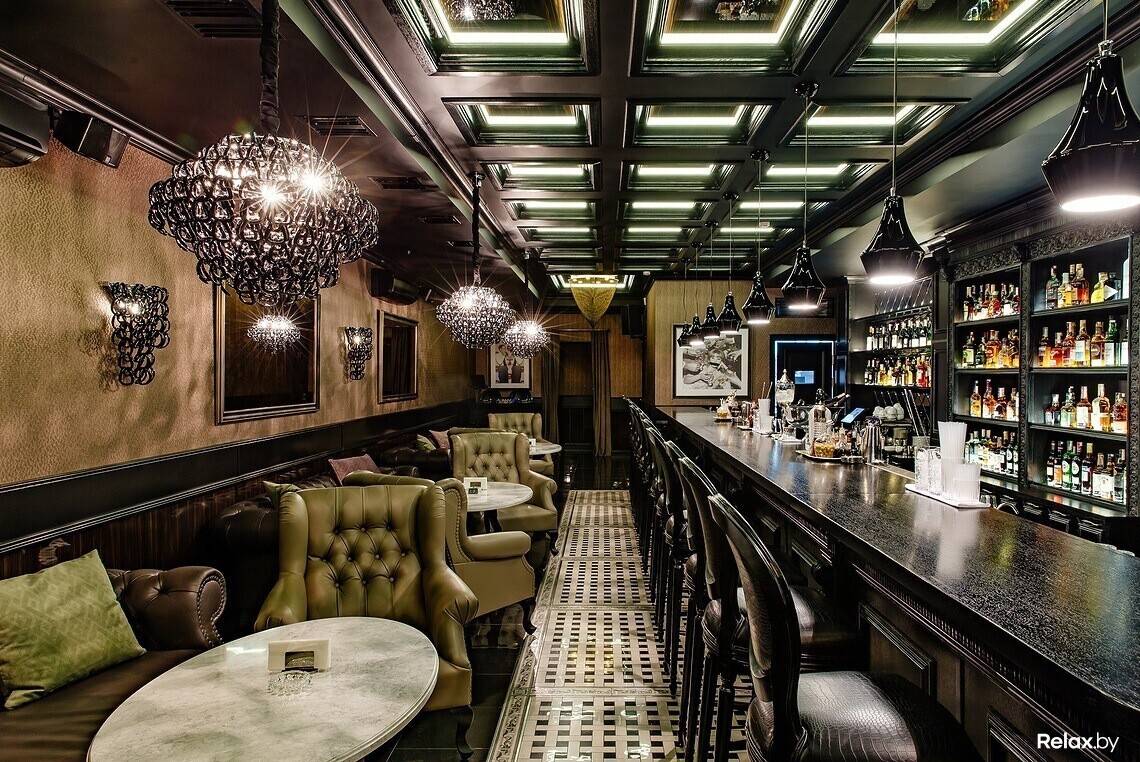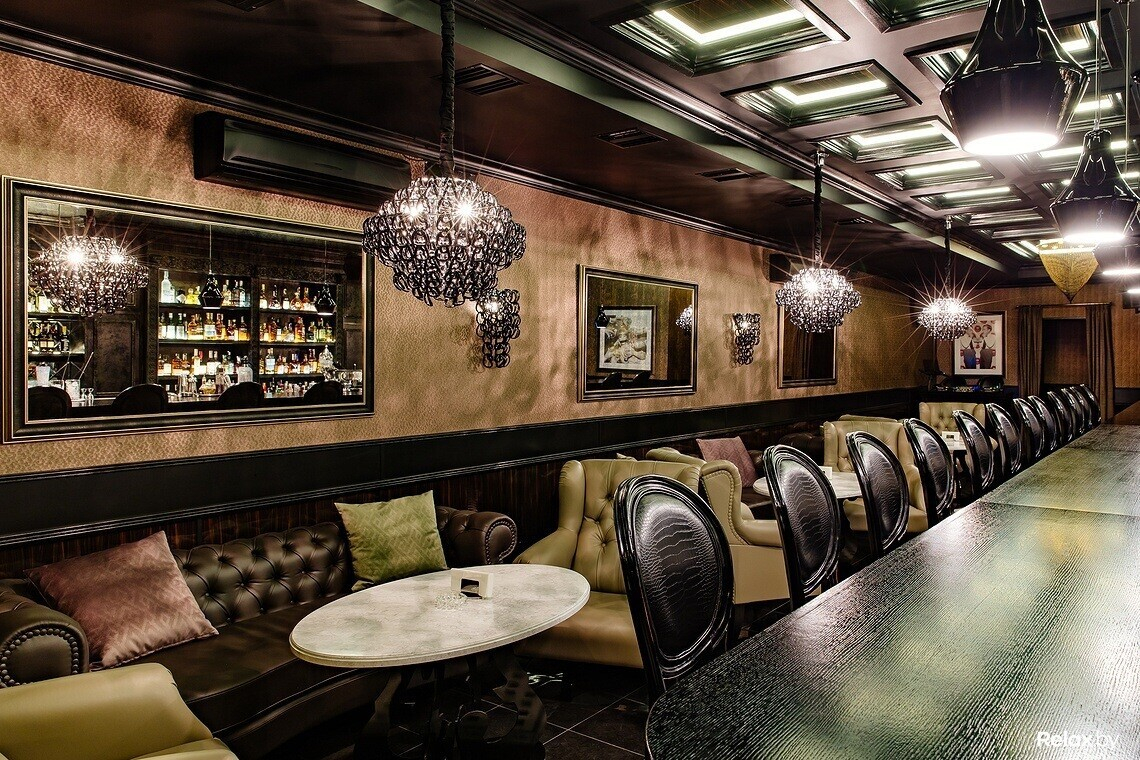 Мозаика, кожаная мебель, каменные столешницы, приглушенный свет роскошных люстр, массивная барная стойка, антикварный инвентарь — интерьер продуман до мелочей.
