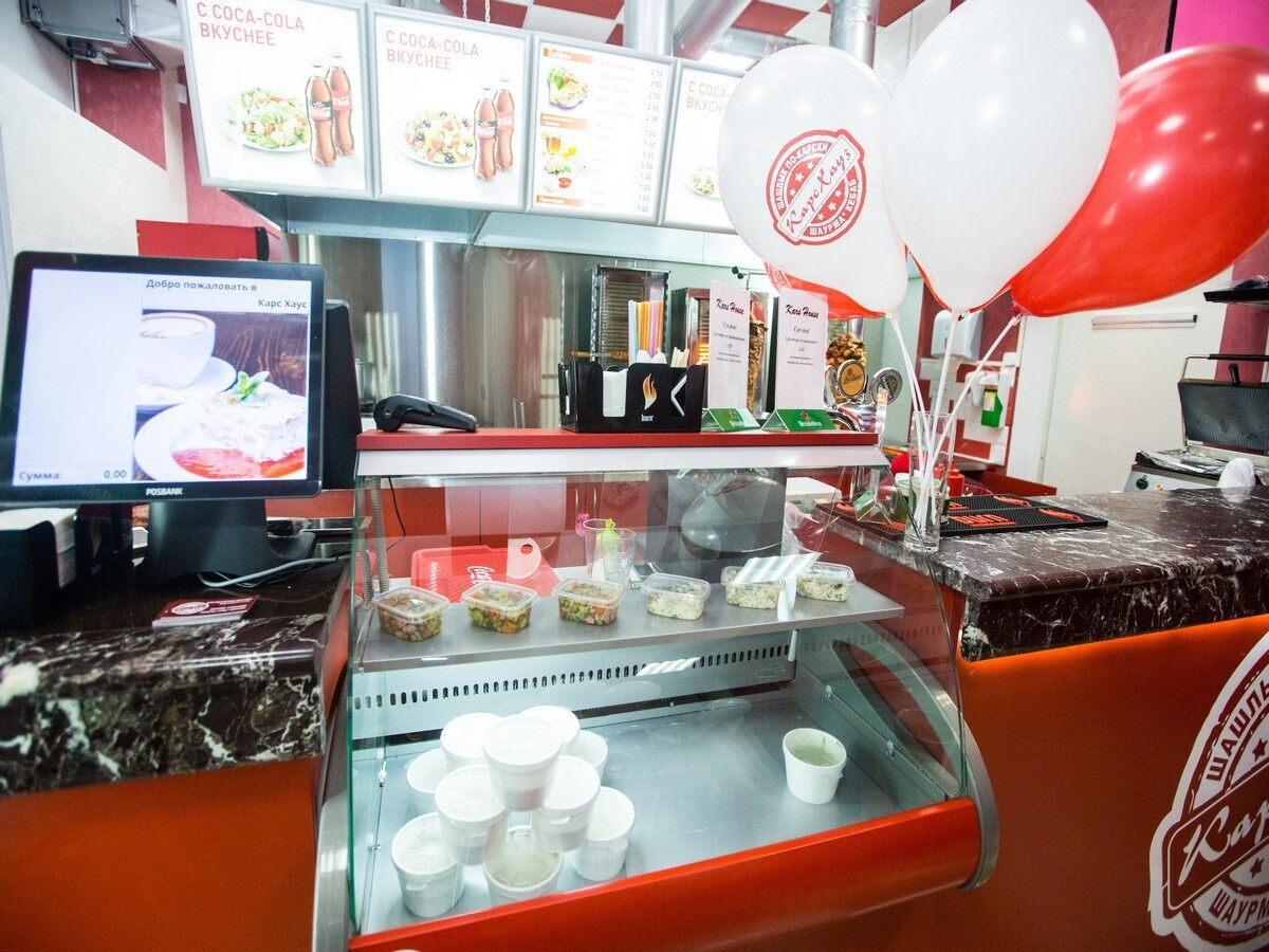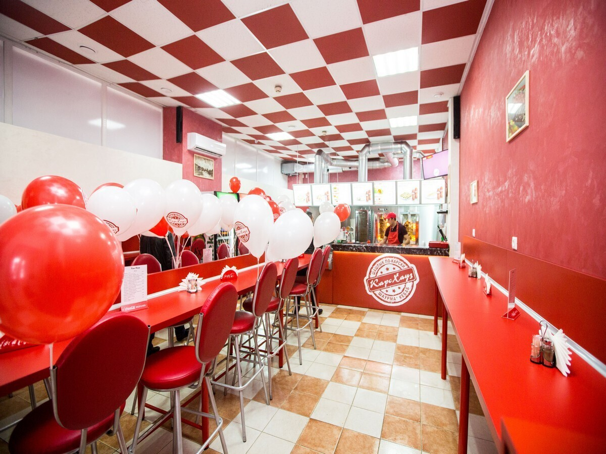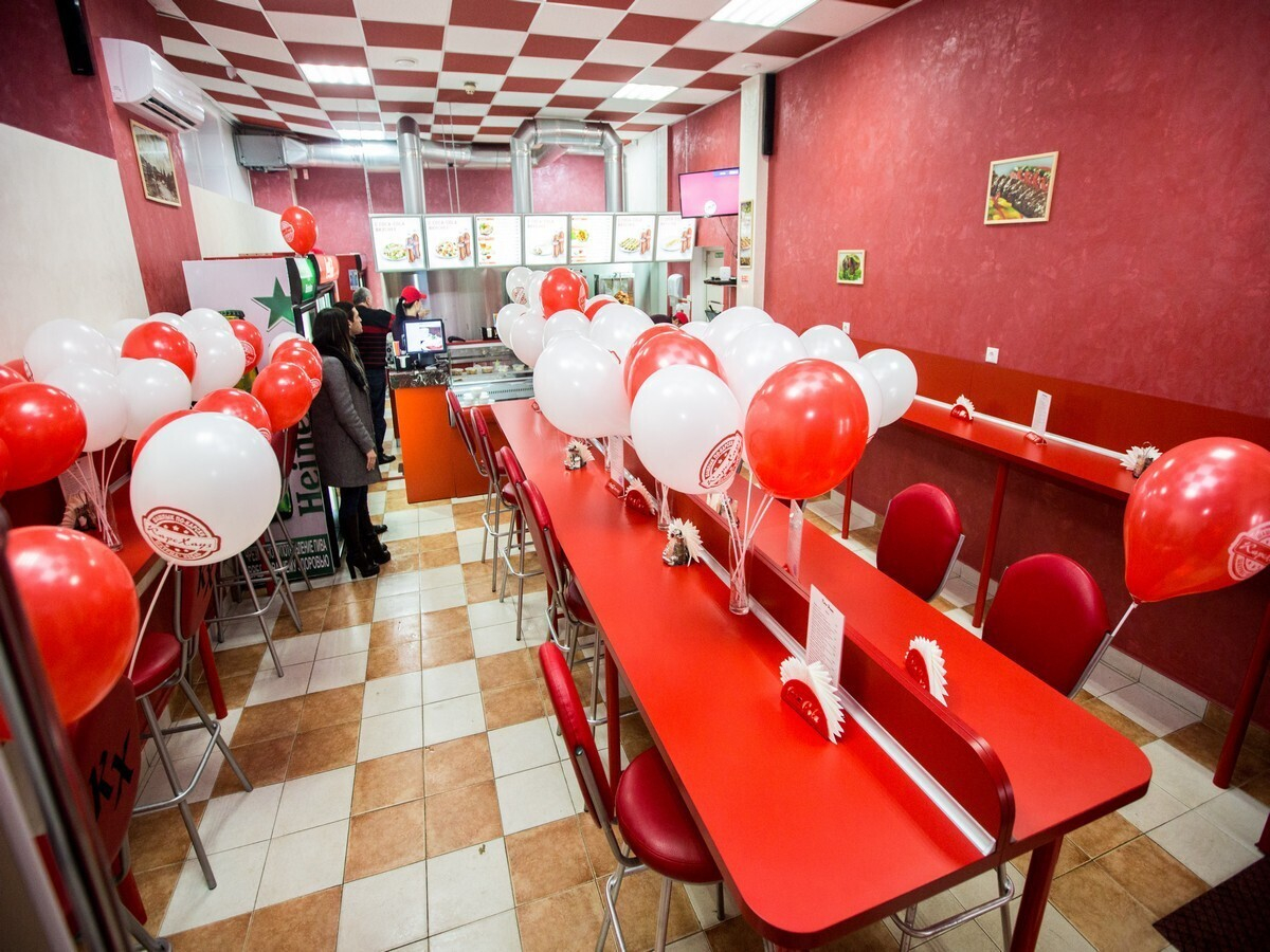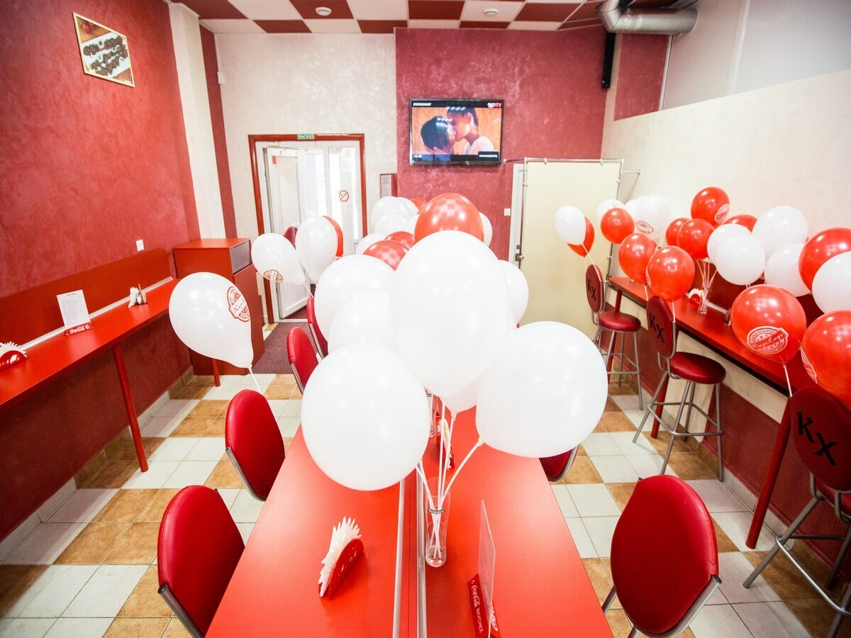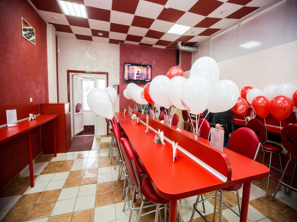 В зале для гостей предусмотрены длинные стойки с барными стульями, за которыми можно устроиться для быстрого перекуса. К открытию заведение украсили воздушными шарами.
