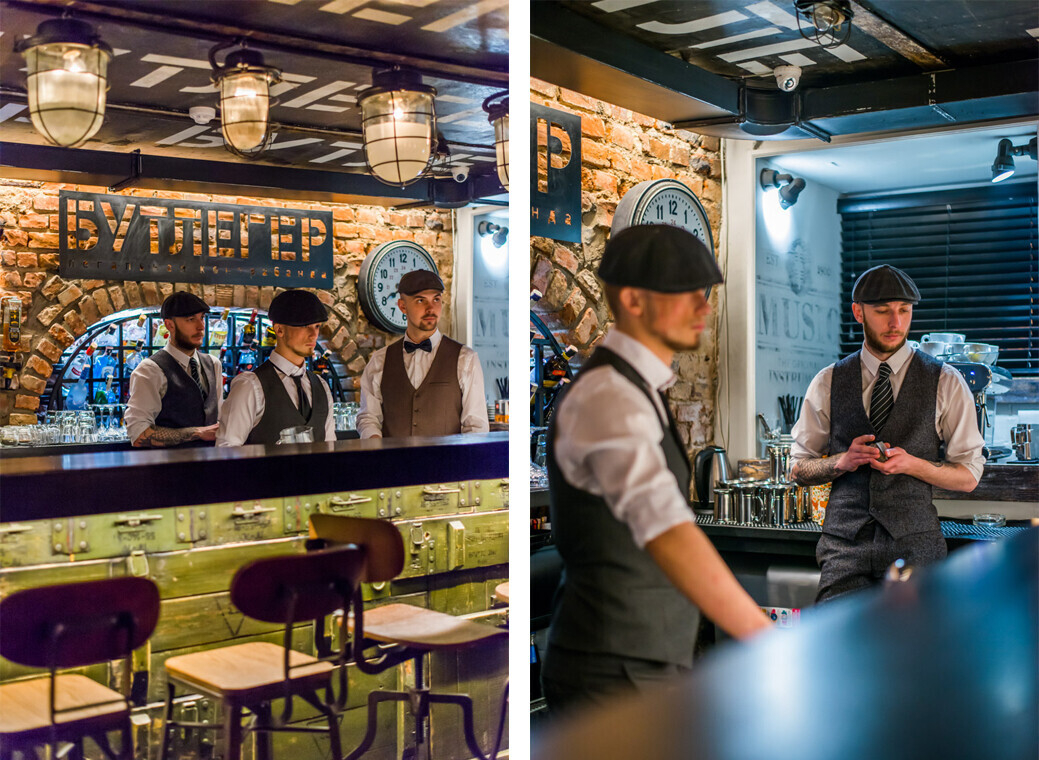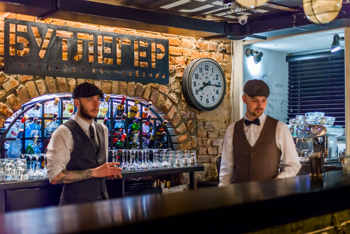 Бармены в «Бутлегере» носят винтажные костюмы и отзываются на тайные имена: гостей радушно встречают и угощают Старик и Чистый, Пацан и Француз. Последний, кстати, помимо основного таланта в смешивании напитков, отлично декламирует стихи на «родном языке».