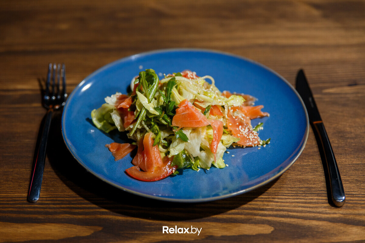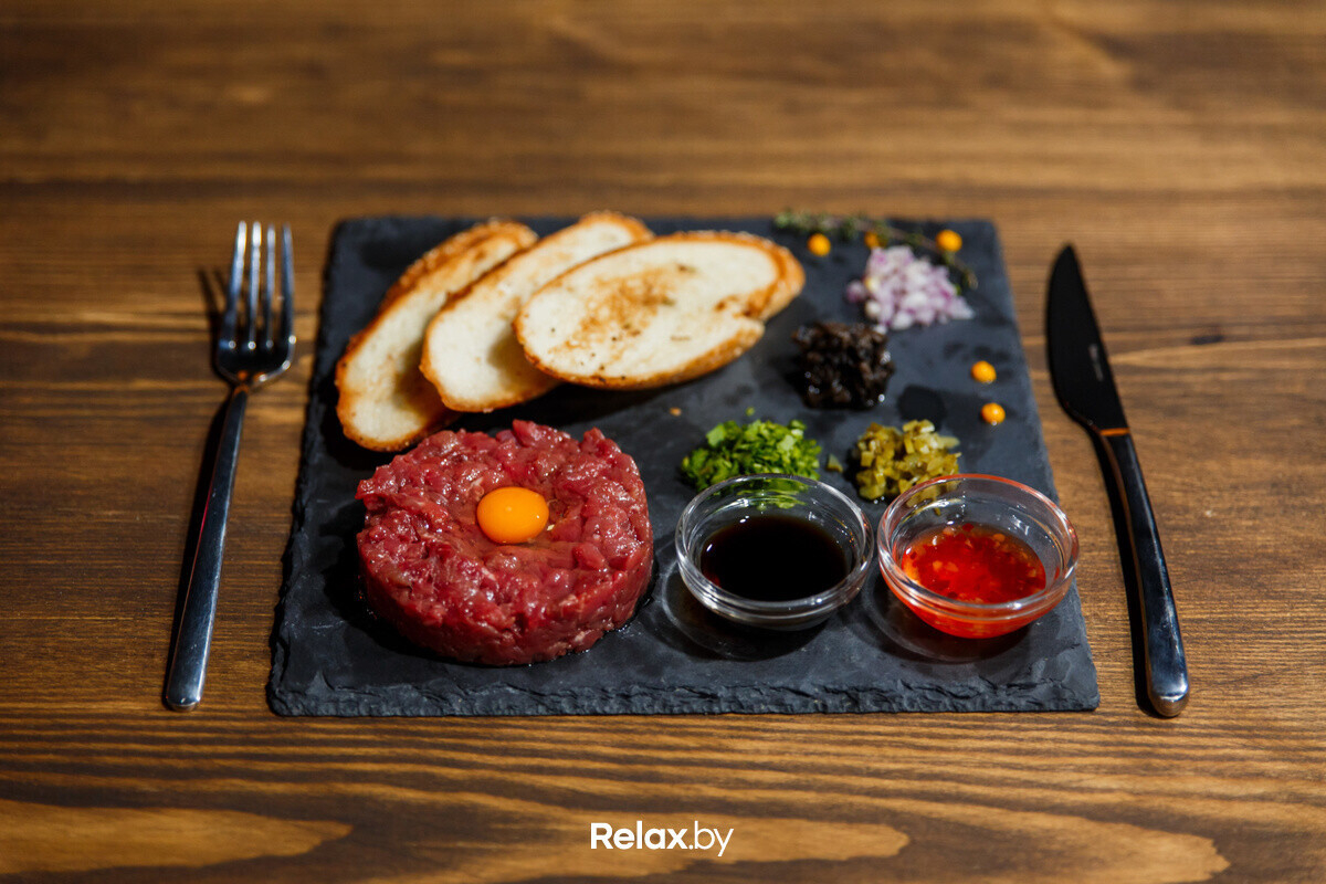 Выбор блюд здесь небольшой, но в заведении обещают их количество увеличить. Основной стала европейская кухня. И порции, надо сказать, немаленькие для стартеров. Здесь рекомендуют попробовать классический тартар из говядины (10 рублей). Также в меню есть разделы салатов, горячих блюд, гарниров и десертов — в каждом блоке по три блюда. Но это пока. Меню будет расширяться, и, возможно, цены тоже изменятся.