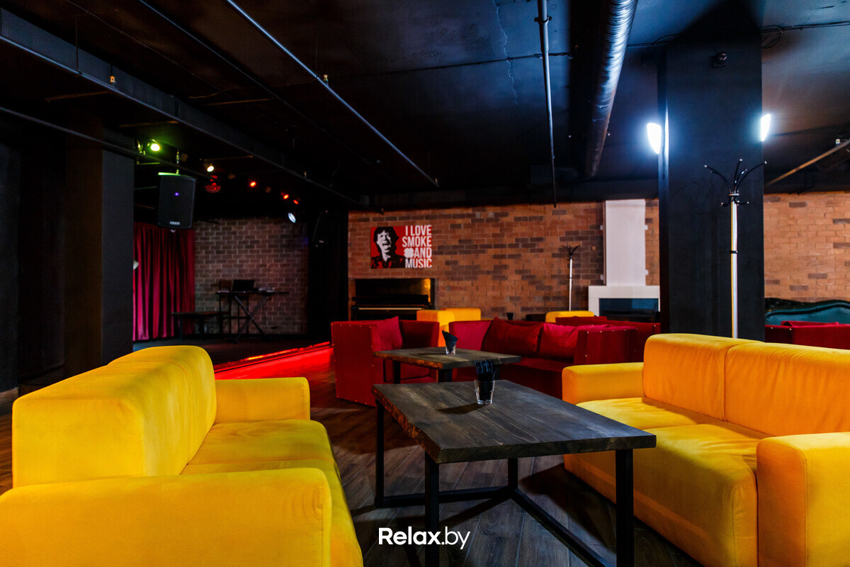 Обращает на себя внимание сцена, подготовленная для живых выступлений. Акцентами стали картины в стиле поп-арт и огромные буквы в стиле ретро, на фоне которых можно сделать фото. Еще одно украшение зала — пианино, которое не только является элементом декора, но и частью выступлений.