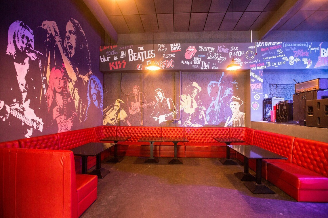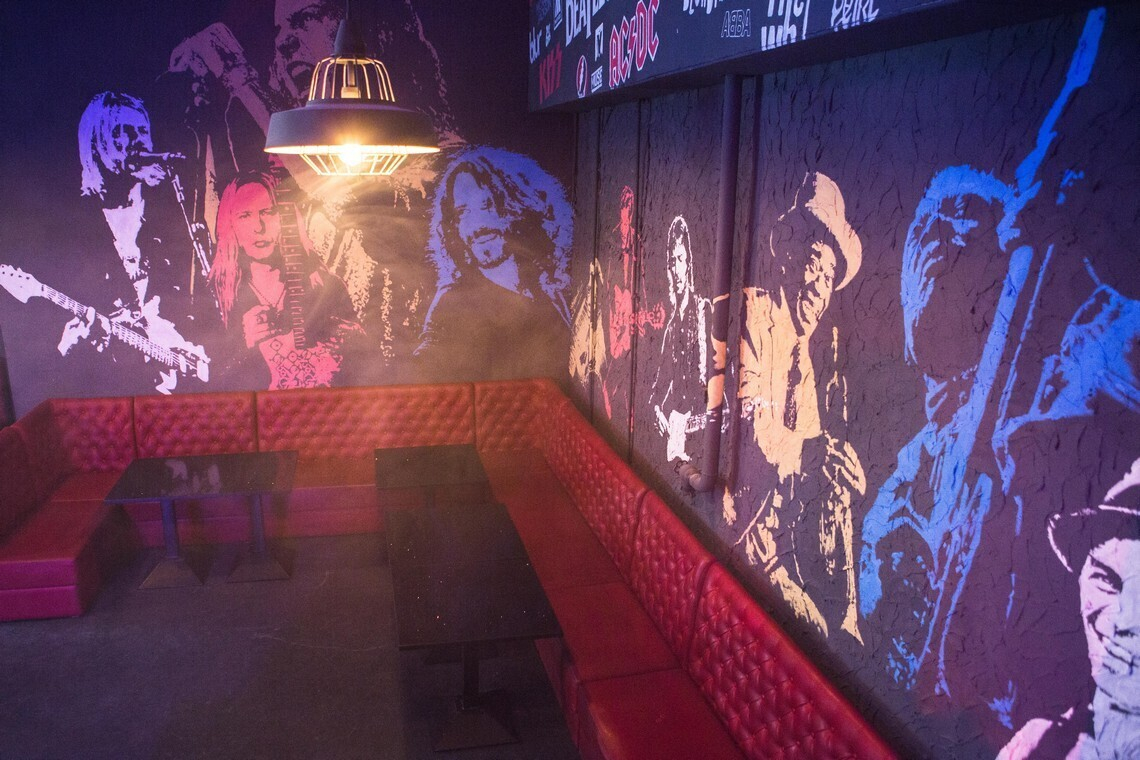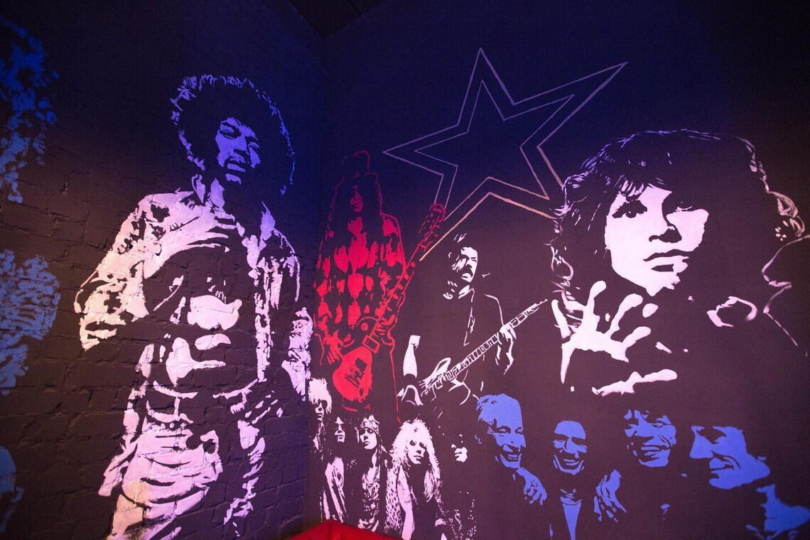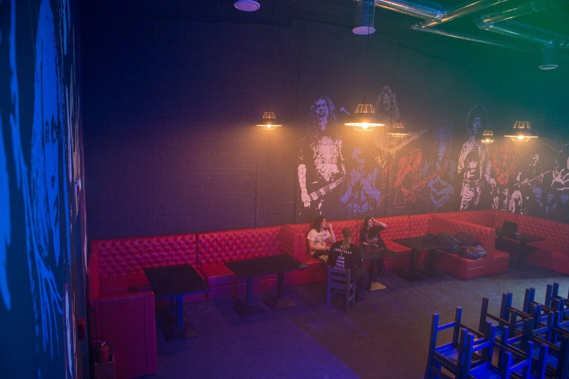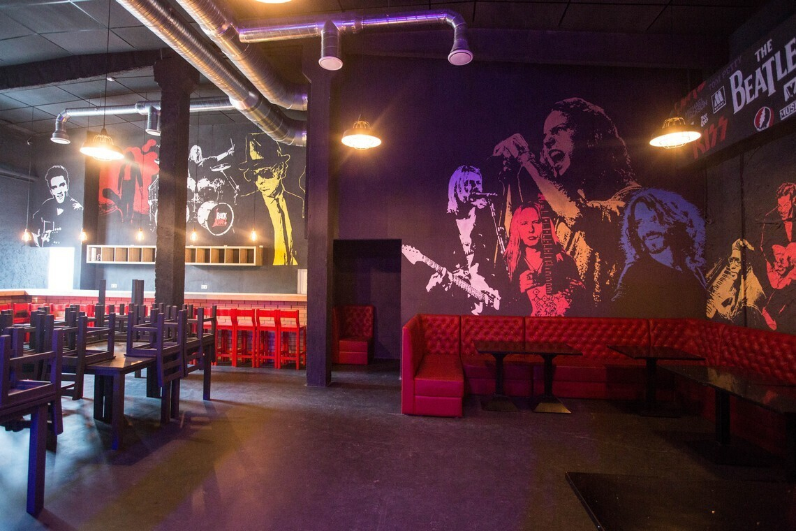 Зал бара с потолками в 6 метров выполнен в темных цветах. На стенах — авторская роспись с изображениями икон рок-музыки: от Оззи Осборна и Курта Кобейна до Джеймса Хэтфилда и Стива Харриса. Вскоре на стенах также появятся электрогитары, а персонажей станет больше, как и логотипов групп над сценой.