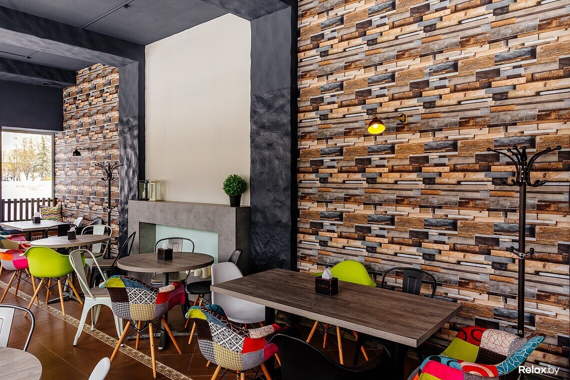 Дизайн заведения дополняют картины в стиле поп-арт, которые специально для проекта нарисовала минская художница. Барная стойка декорирована натуральными березовыми поленьями.