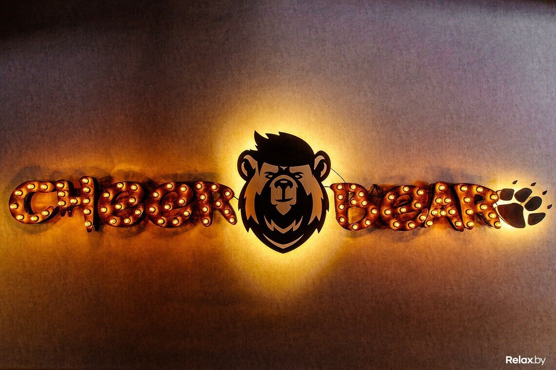 Владельцы долго не могли решить, как же назвать заведение. Идея пришла из простых ассоциаций. Слово «bear», созвучное с «beer» подчеркнуло брутальную составляющую заведения — места для парней. А «cheer» — от радостного возгласа, который произносят, чокаясь бокалами. Собранное воедино название можно перевести и как «веселый медведь», и он как раз-таки изображен на логотипе бара.