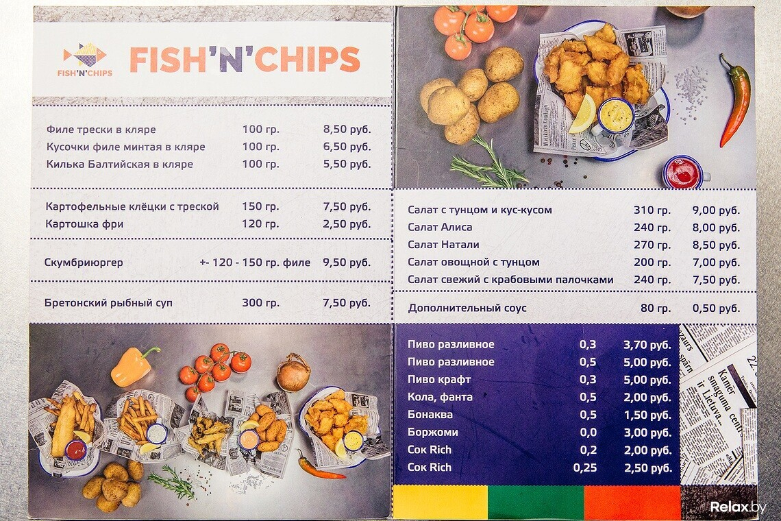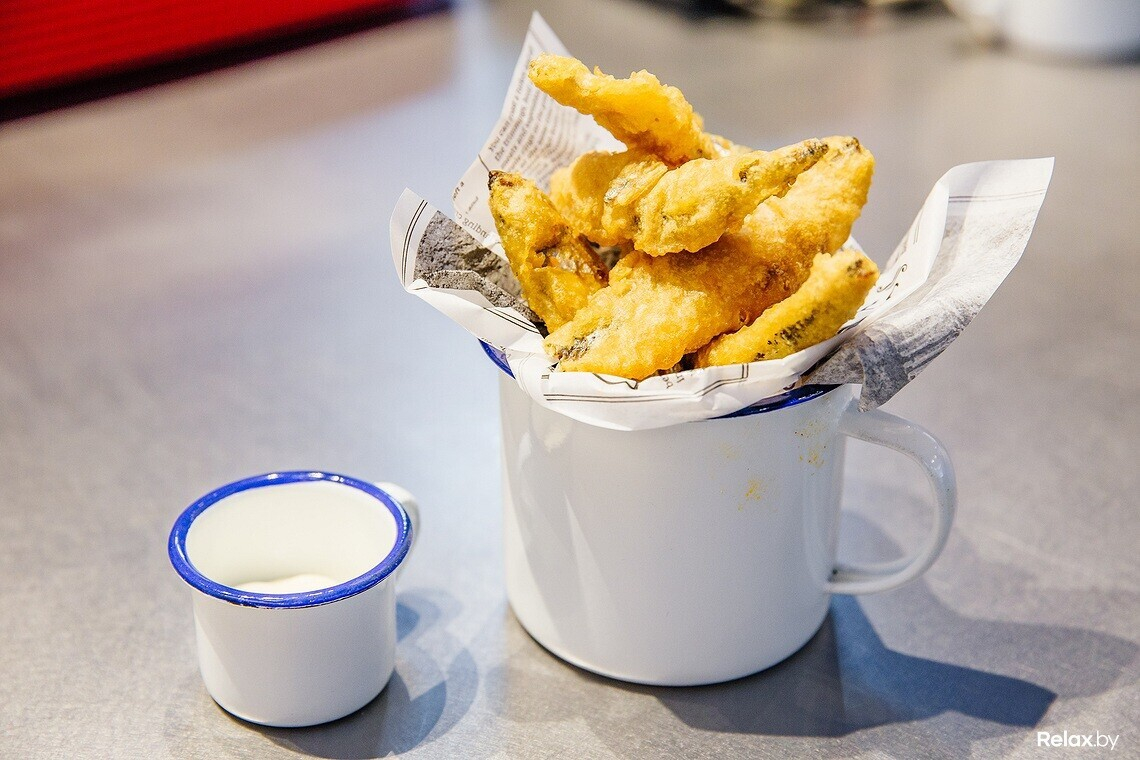 Цены на рыбное меню в «Fish&Chips» начинаются от 5,5 рубля. Так, меньше всего придется потратить на «Кильку балтийскую в кляре», а за филе трески в таком же исполнении — 8,5 рубля. Оригинальный «Скумбриюргер» обойдется в 9,5 рубля.