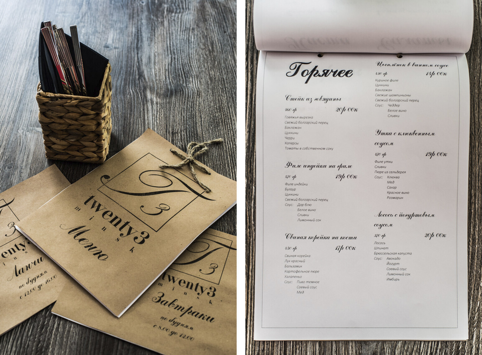 Меню Twenty3 состоит из блюд европейской кухни с авторскими позициями шеф-повара. Из итальянской еды — паста. Французские суп «Сен-Жермен» и клафути с черникой, бельгийская похлебка «Ватерзой», стейки, а также рыбные блюда.