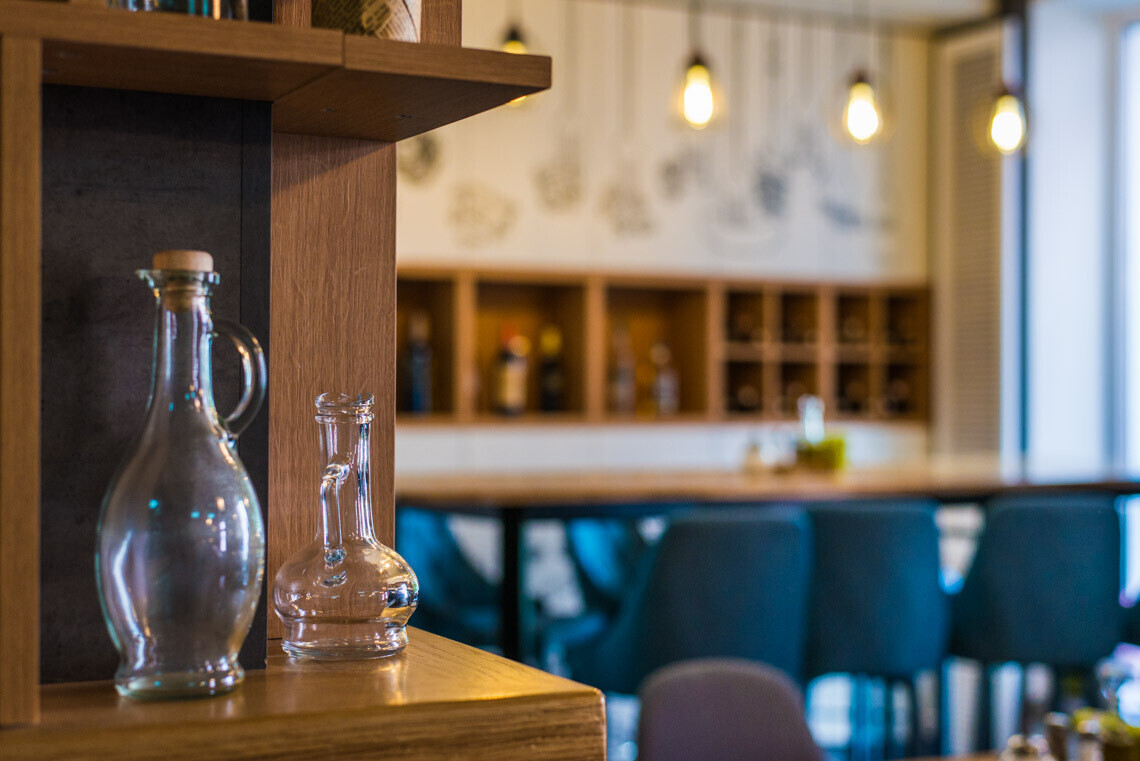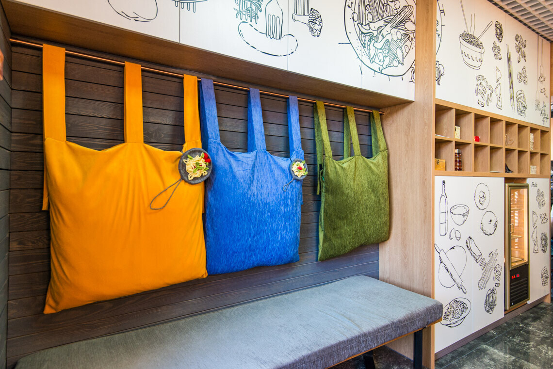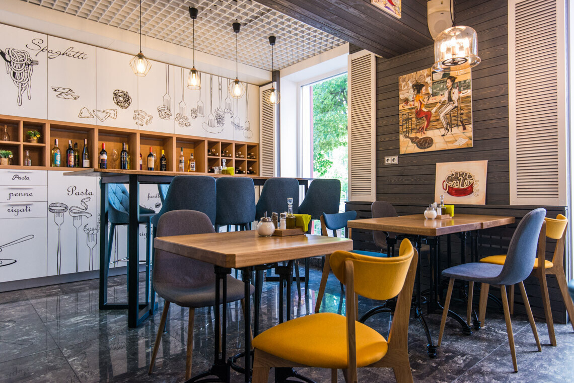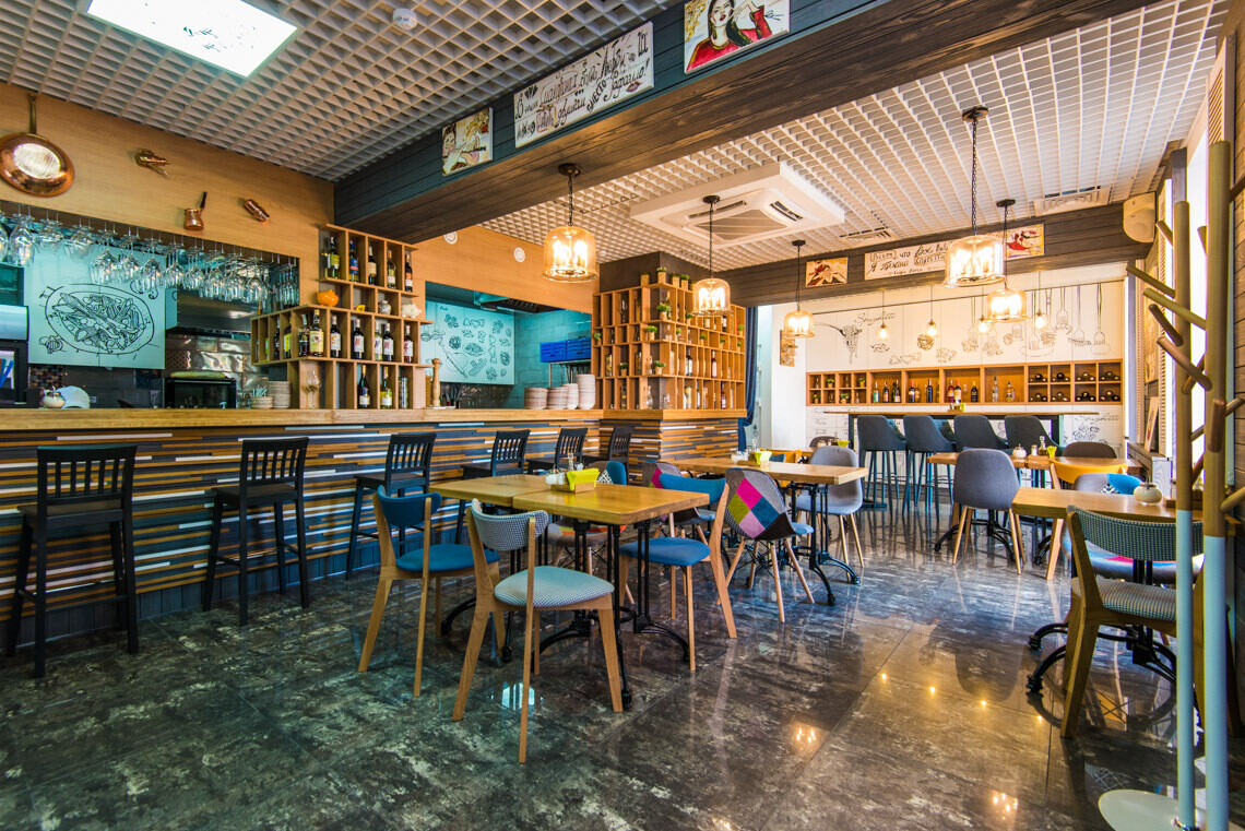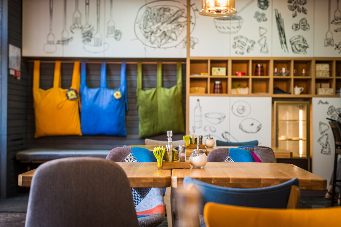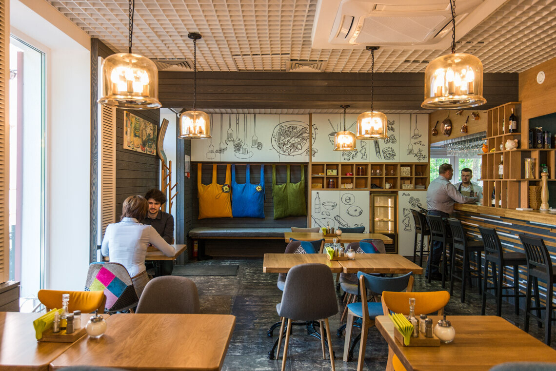 В пастерии царит игривая атмфосфера: ее поддерживают причудливые рисунки на стенах, яркая мебель и разноцветные подушки. Открытая кухня, барная стойка и гостевой зал — все расположено так, чтобы между персоналом и гостями не было барьеров и препятствий.