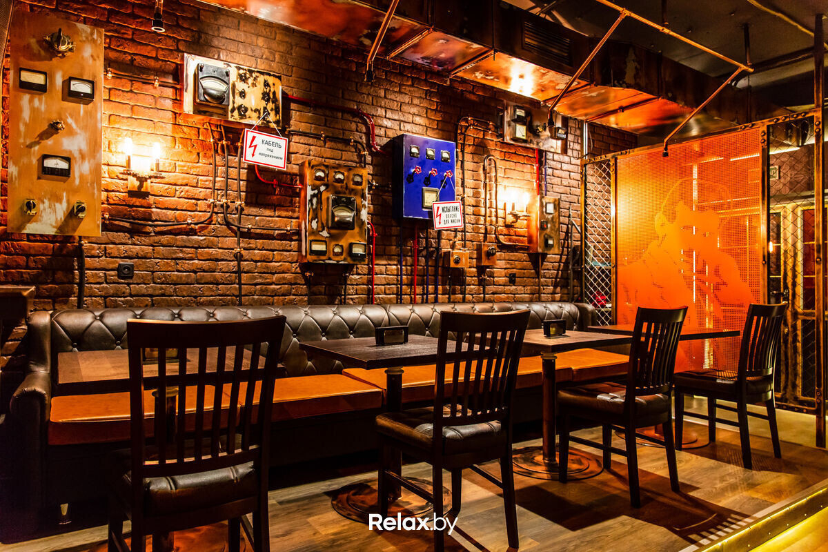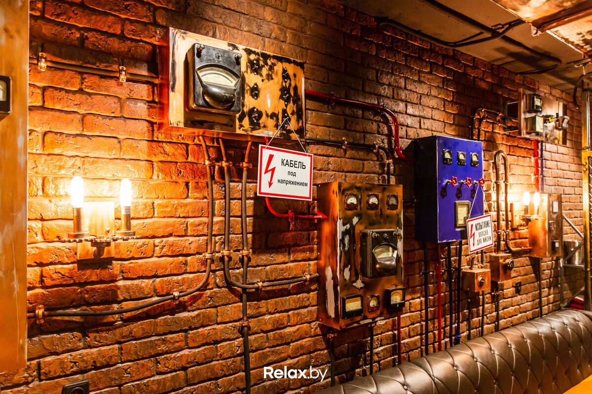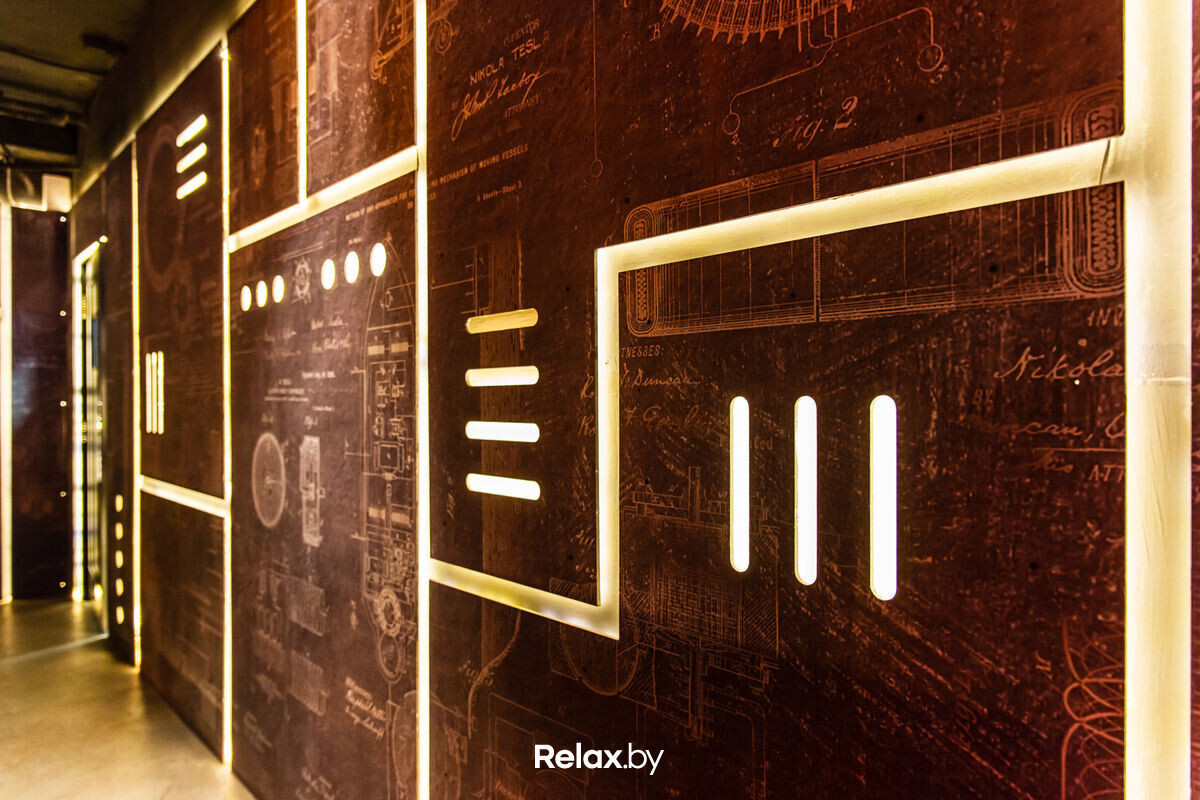 Заведение выполнено в стиле теслапанк. Именно он позволяет раскрыть гениальность великого ученого и отразить дух его эпохи. Разрабатывал интерьер дизайнер Андрей Шишкин.