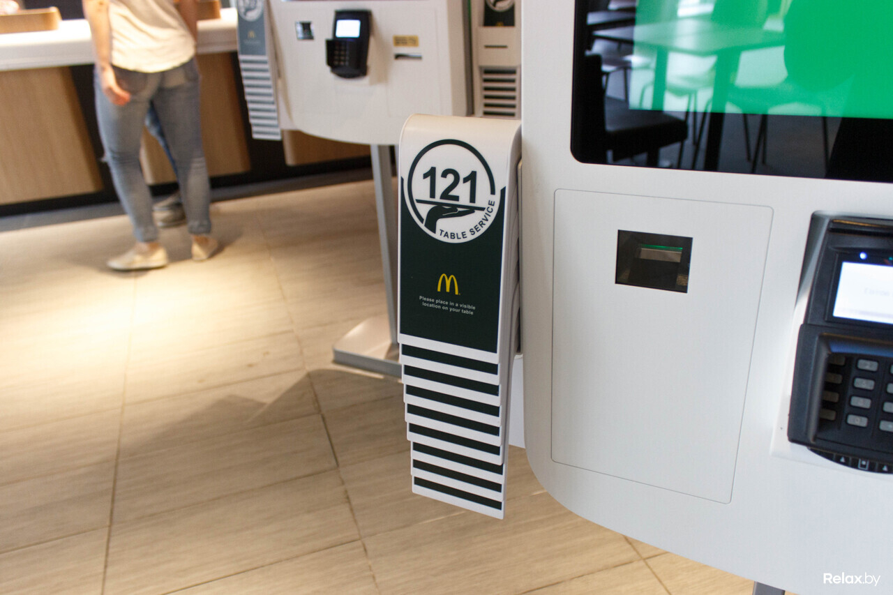 После оформления заказа в киоске самооблуживания есть две опции: забрать его как обычно или выбрать обслуживание за столиком. Для этого нужно взять пронумерованную табличку-локатор со встроенным радиомодулем в боковом держателе киоска.