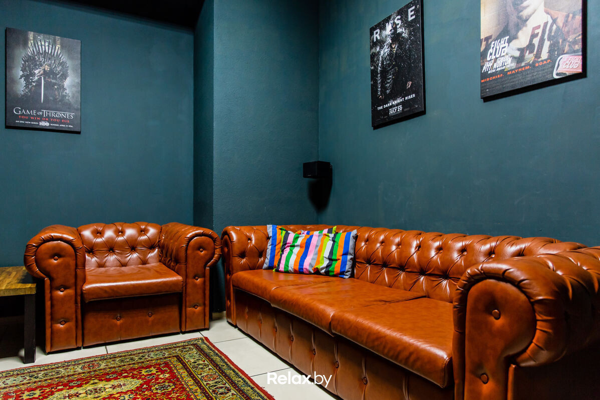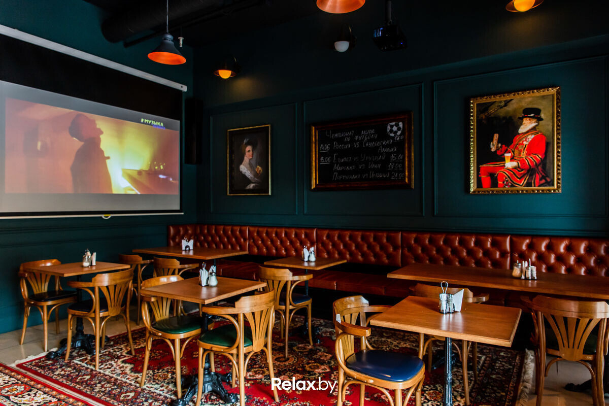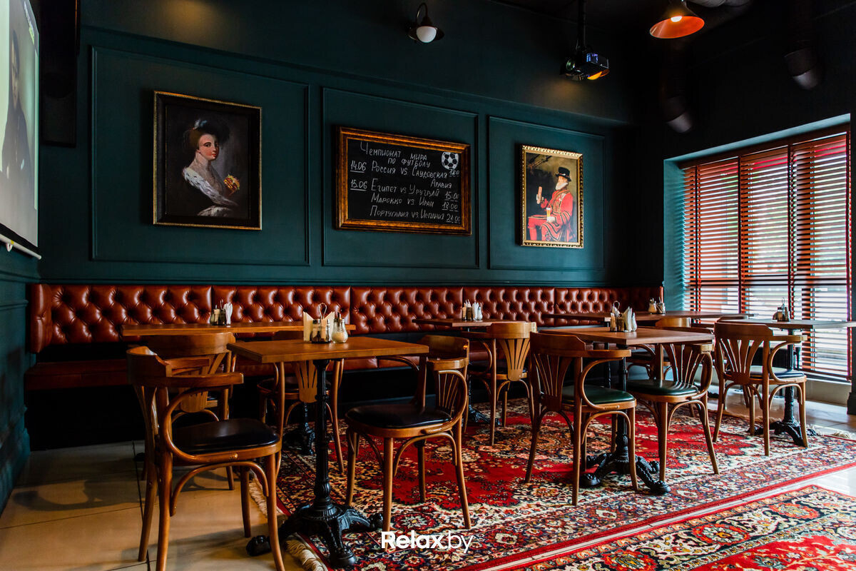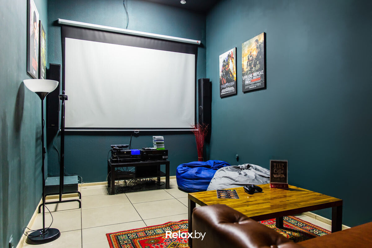 Основной обеденный зал оформлен в сочетаниях глубокого зеленого и синего, дополненных теплыми тонами деревянной мебели и барной стойки. В «кинокомнатах» стены более нейтрального цвета, а кресла-мешки и кожаные диваны добавляют комфорта.