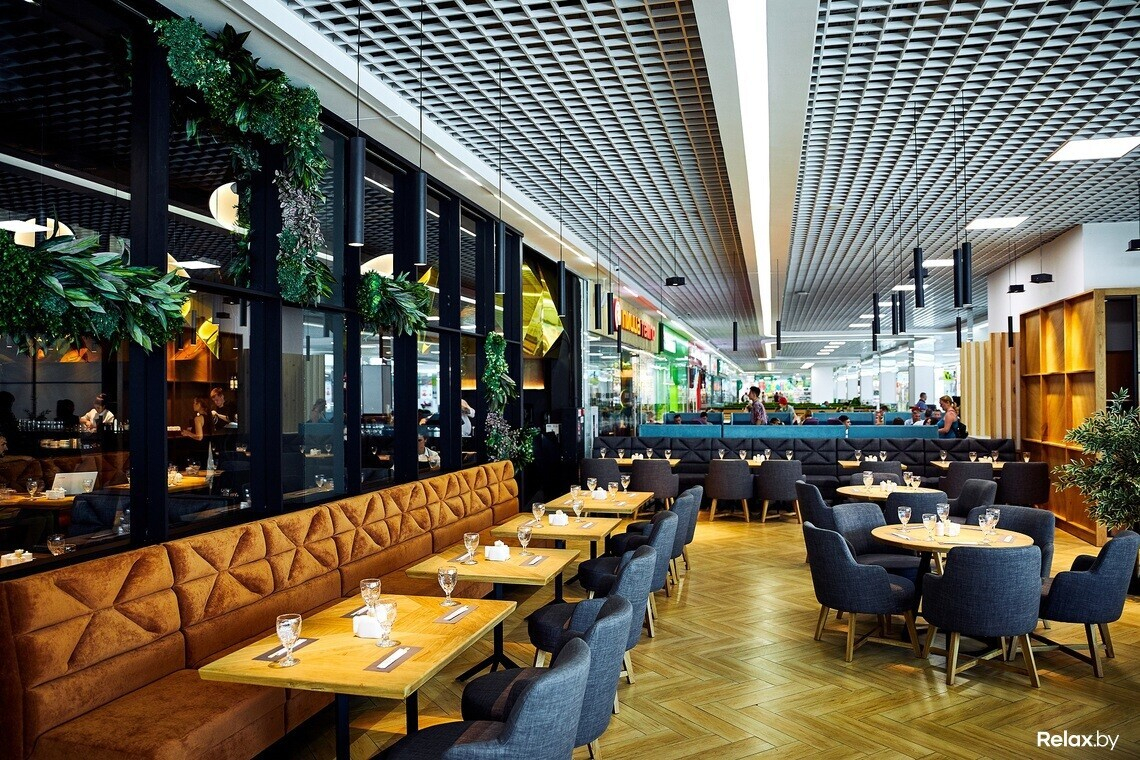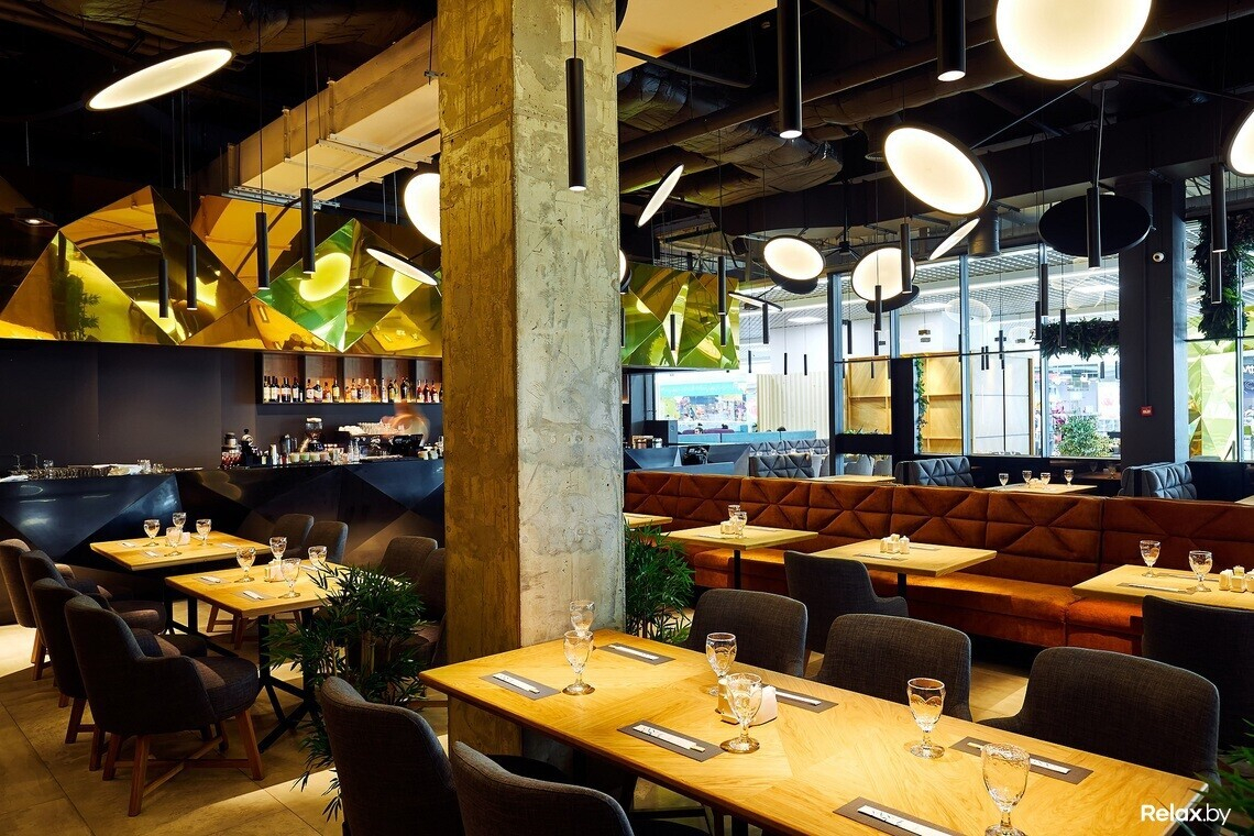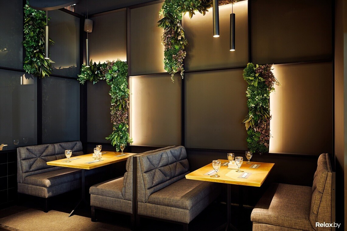 Новый ресторан по своему стилю очень напоминает первый, расположенный в Green City: преобладающие темные тона, поддерживающие эко-тему зелень и шпон. К потолку подвешены светильники причудливой формы, напоминающие десятки хаотично разброшенных зеркал.