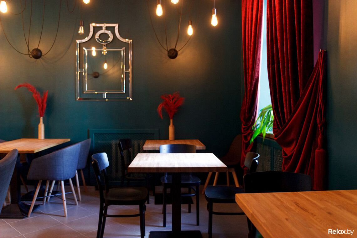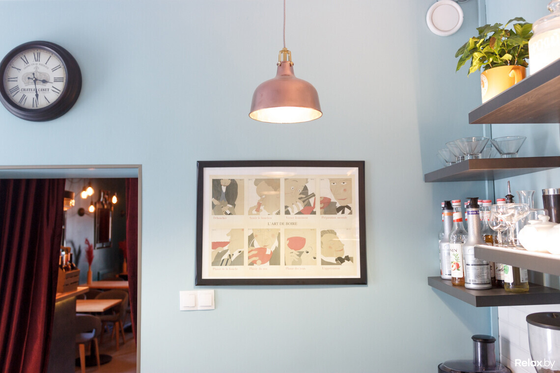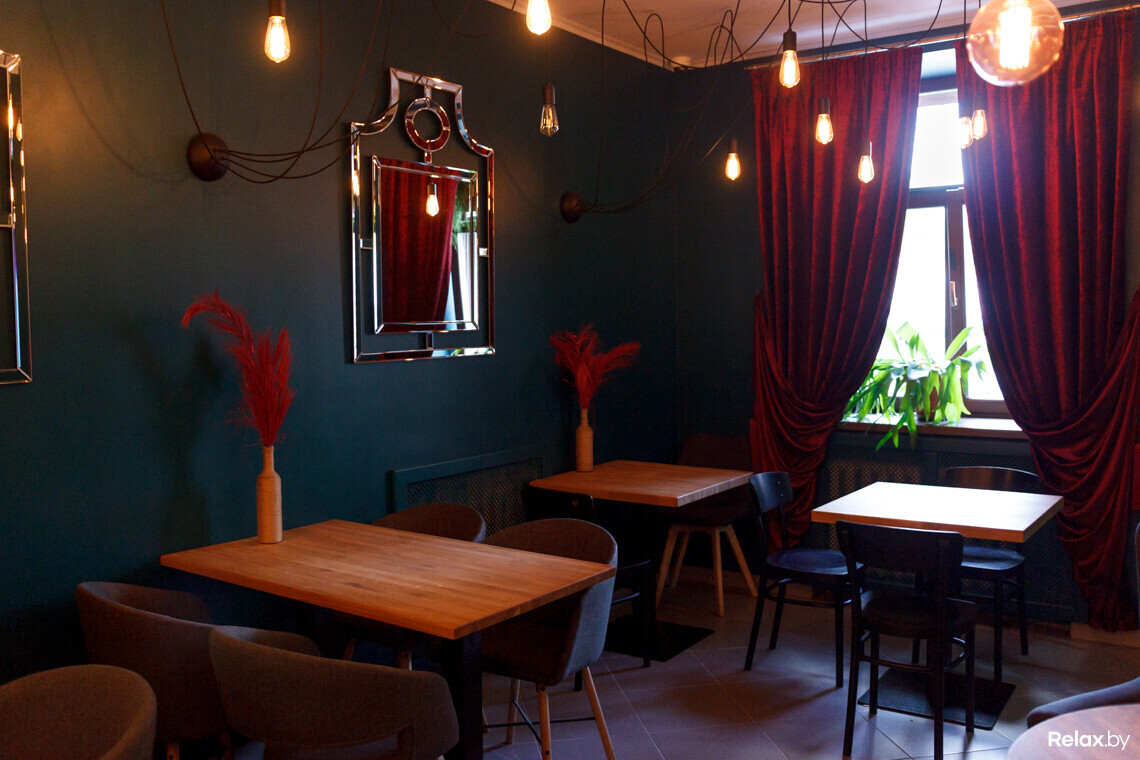 В обеденном зале находится контактная стойка сомелье, за которой стеллаж на 180 бутылок, а также столики на 19 посадочных мест. При необходимости они сдвигаются вместе для больших компаний.