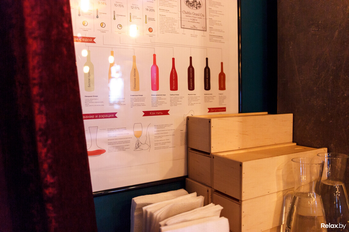 Неудивительно, что с такой концепцией и названием акцент в заведении сделан в пользу вина. Тем не менее, в нем будет и своя кухня. Блюда в меню разделены по сочетаемости с напитками, а официанты с сомелье в любой момент сориентируют, что и с чем лучше заказать.