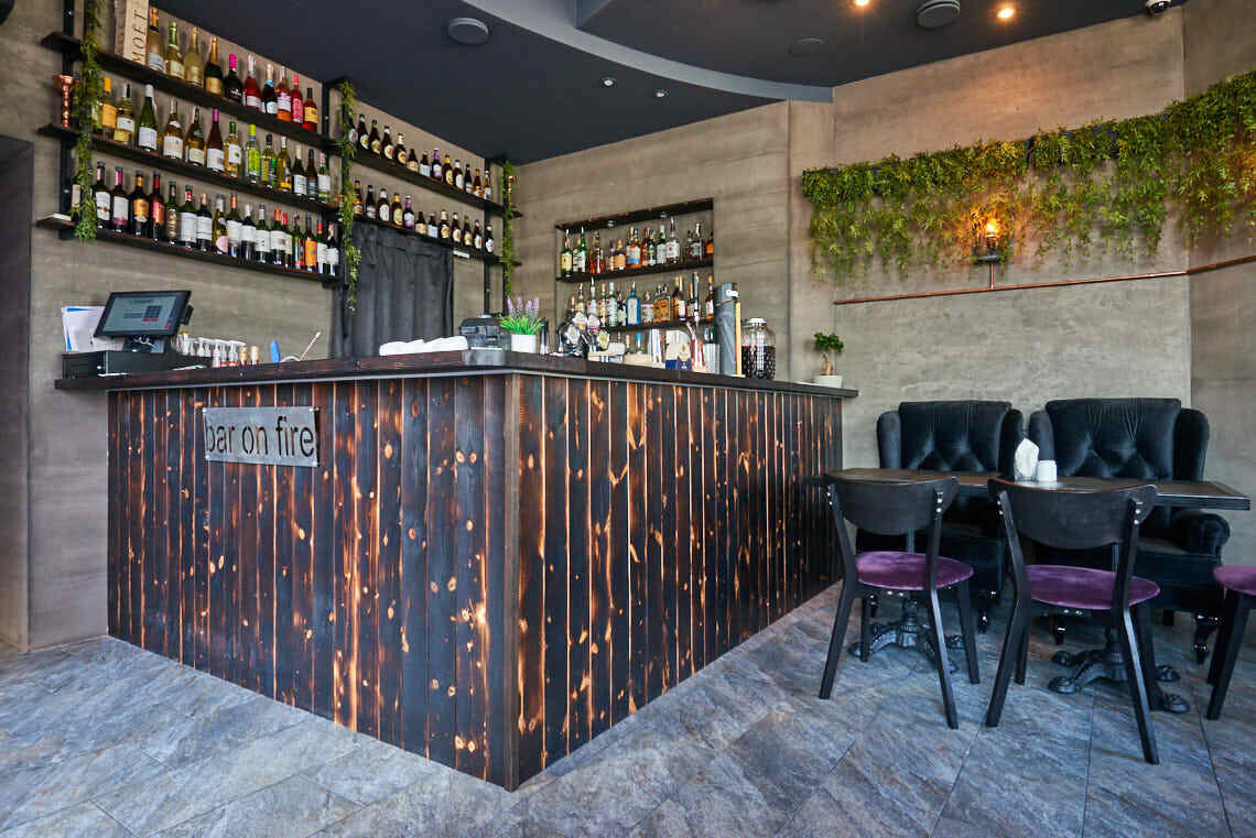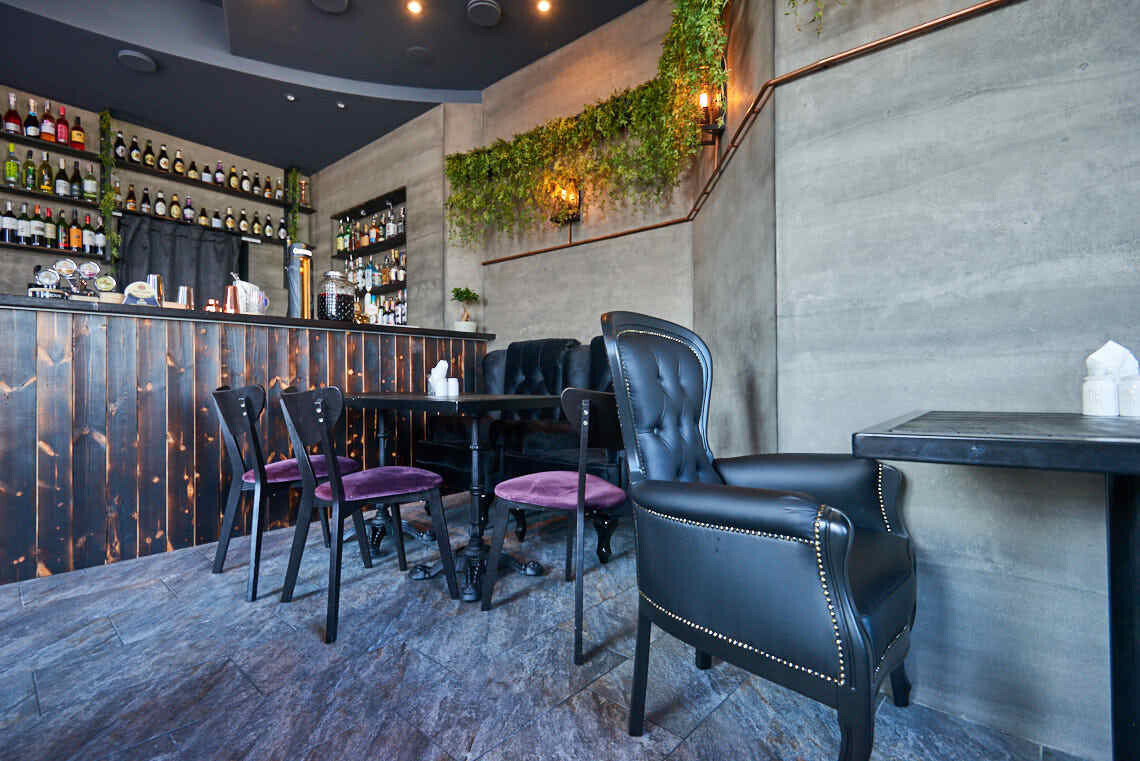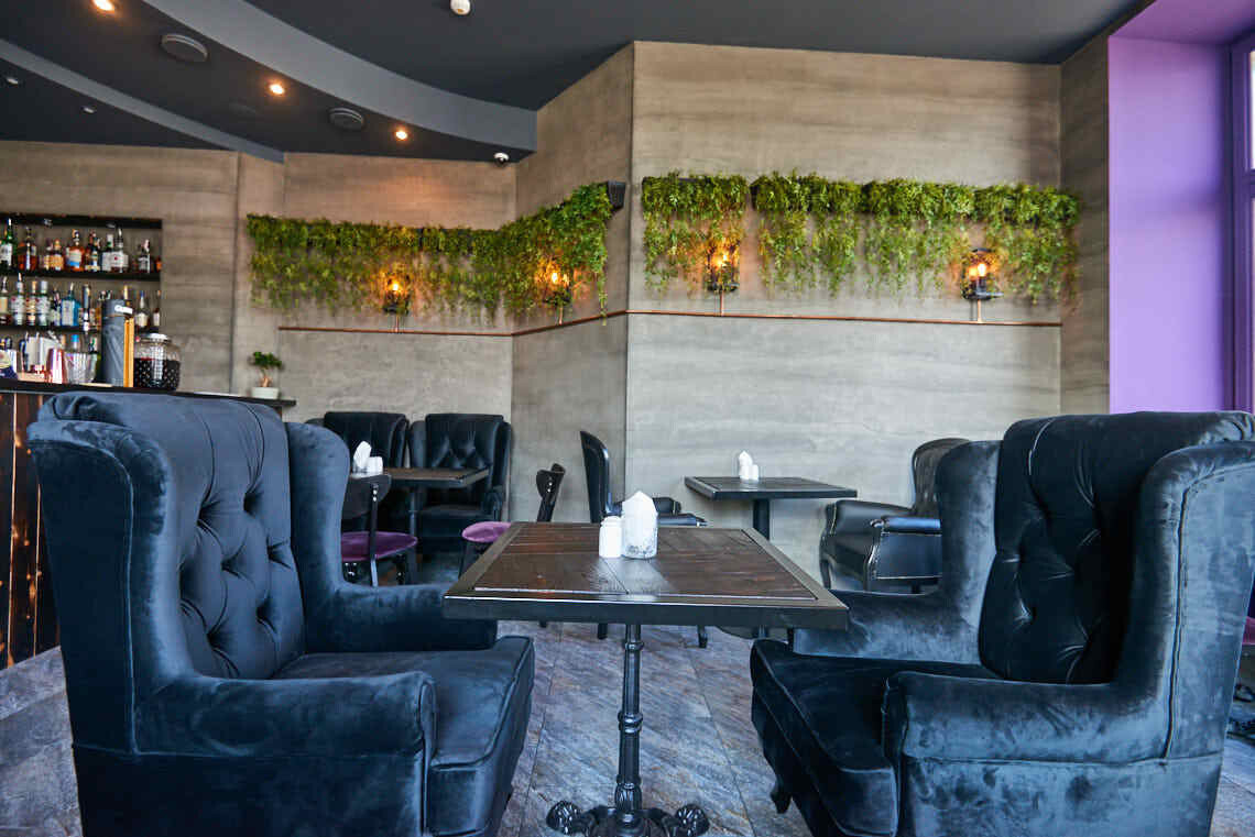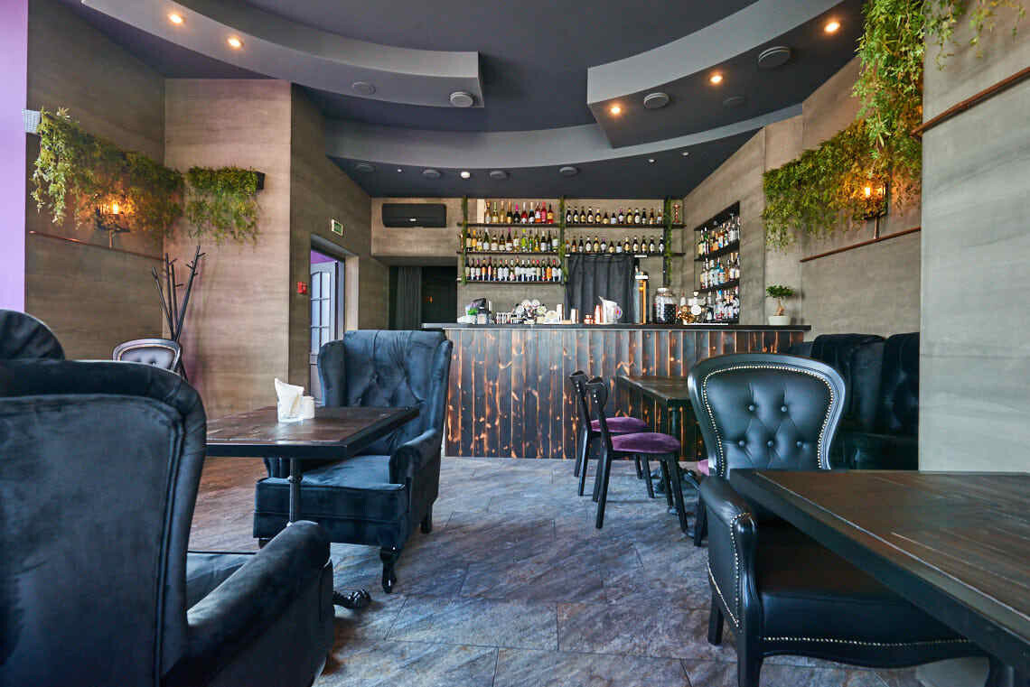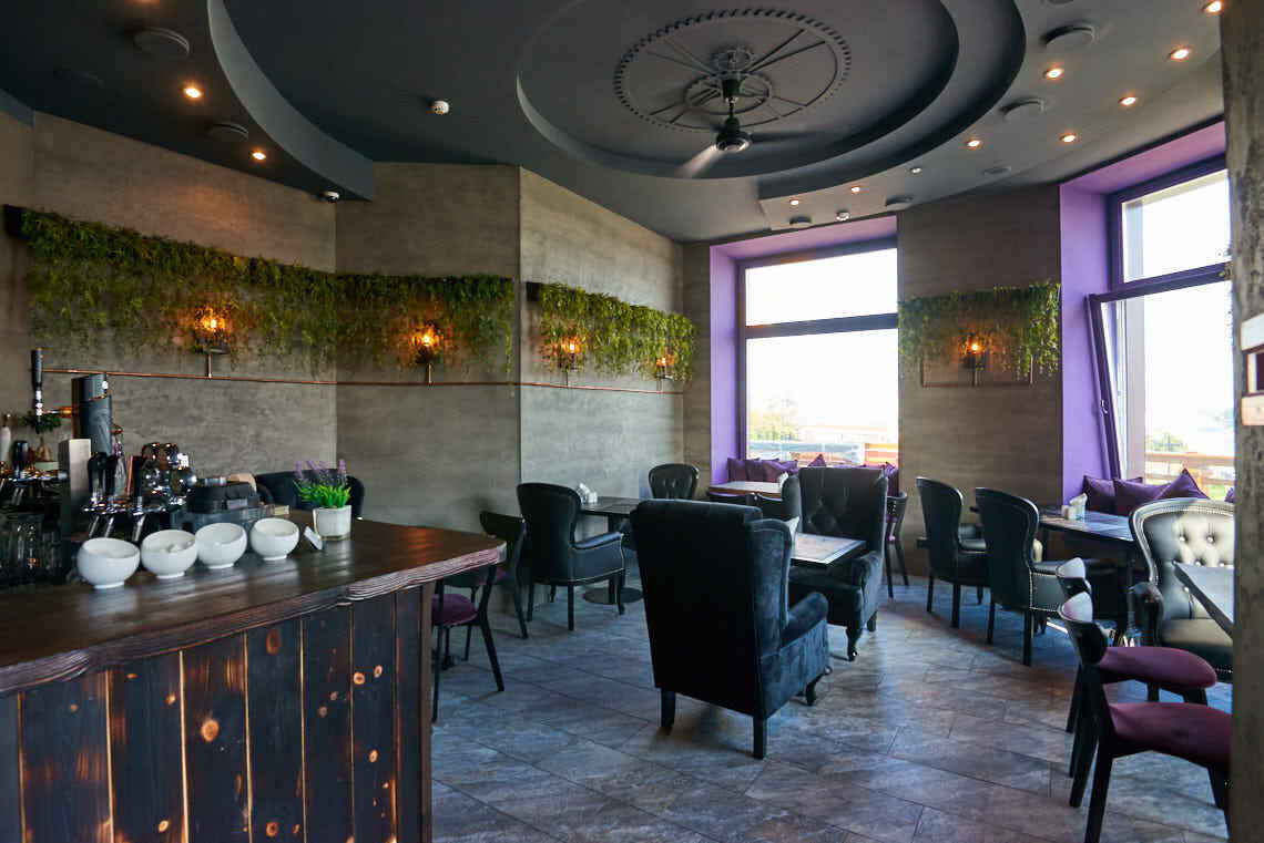 Планировку и внутреннее оформление гастропаба «Высота 281» делала архитектурная студия Zrobym. В интерьере преобладают темные тона, которые контрастируют с фиолетовыми элементами: подушками, диванами, а также цветом оконных проемов.