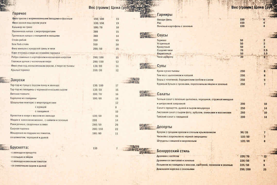 Выделяются среди позиций меню речные раки. Их стоимость, приготовленных в пиве, достигает 20 рублей. Раков держат в специальной емкости в холодильной камере. «При низких температурах они даже ползают по своей емкости. Раки — очень затратный продукт», — говорят в заведении. Есть премиумные позиции стейков — New York и рибай — за 50 и 65 рублей соответственно.