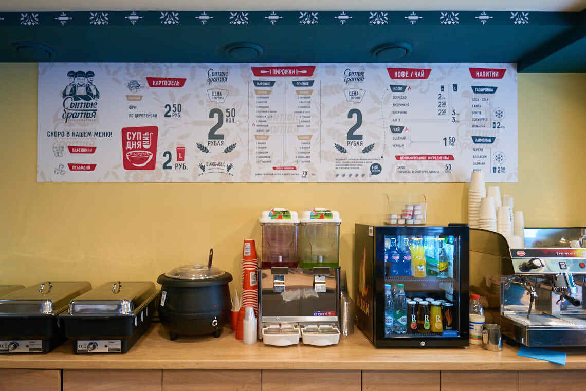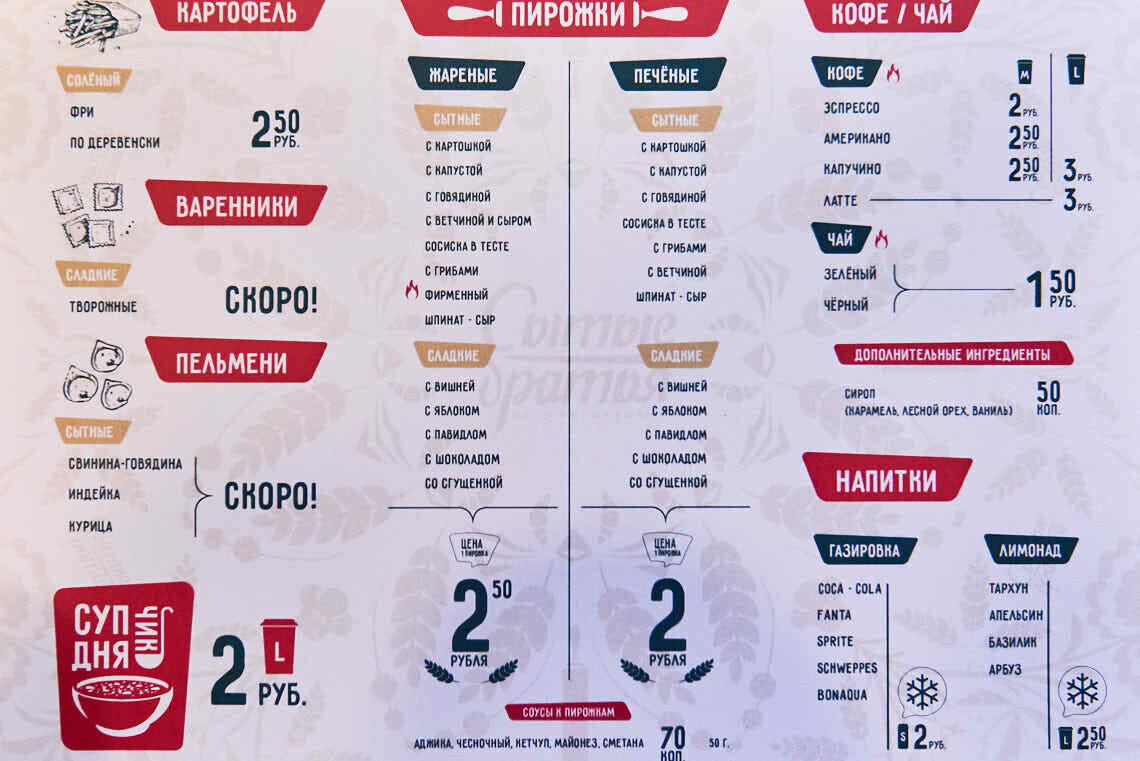 Печеные пирожки в заведении стоят 2 рубля, жареные — 2,50. Кроме того, в меню «Сытых братьев» добавили суп дня за 2 рубля.