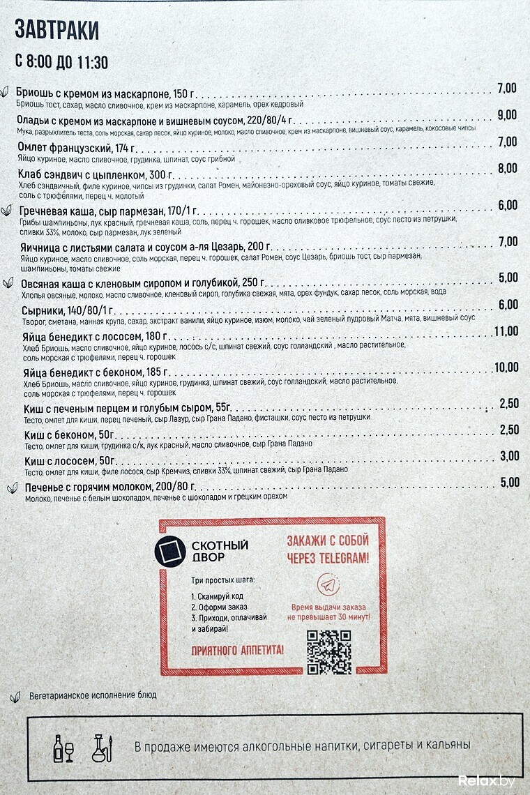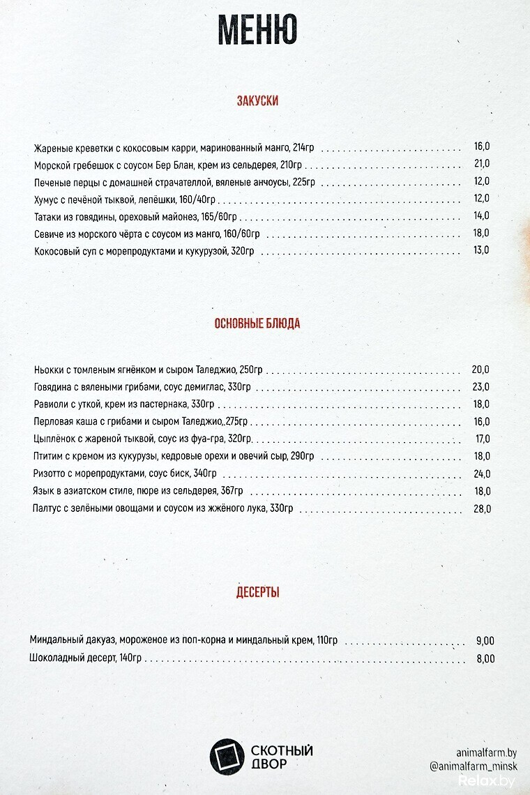 Сейчас ресторан работает с 8:00 до 23:00, по субботам и воскресеньям открывает двери в 11:00. «Скотный двор» находится по адресу Платонова, 20Б.