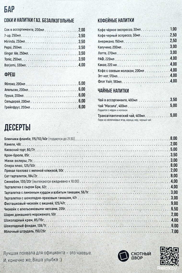 В «Скотном дворе» есть разделение на меню завтраков, обедов и основное, которое действует вечером. Работает собственная пекарня, а мясо перед приготовлением отправляют на неделю в специальный шкаф для «созревания», где оно ферментируется.